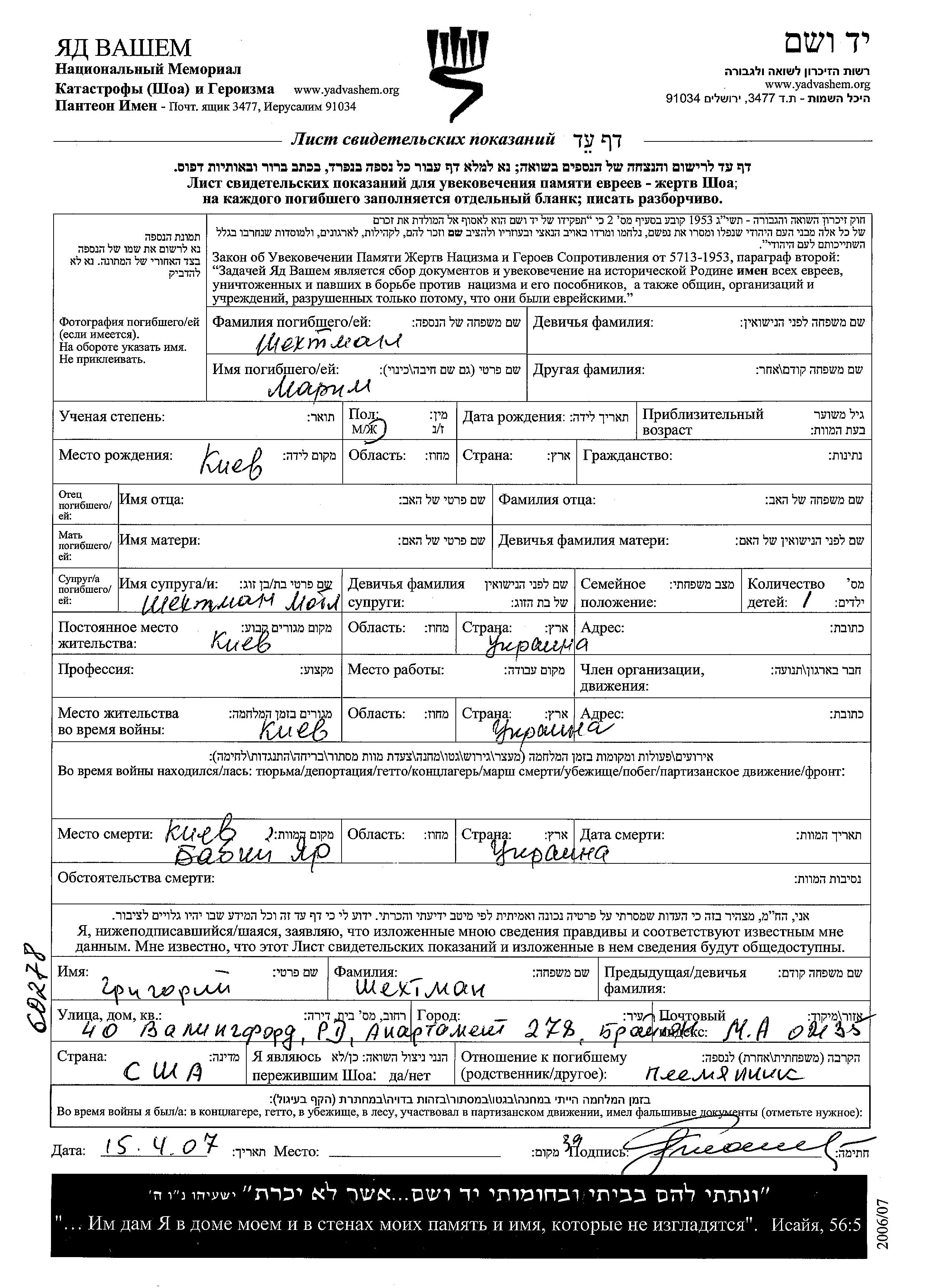Шехтман Марим Киев, Украина (СССР) Лист свидетельских показаний