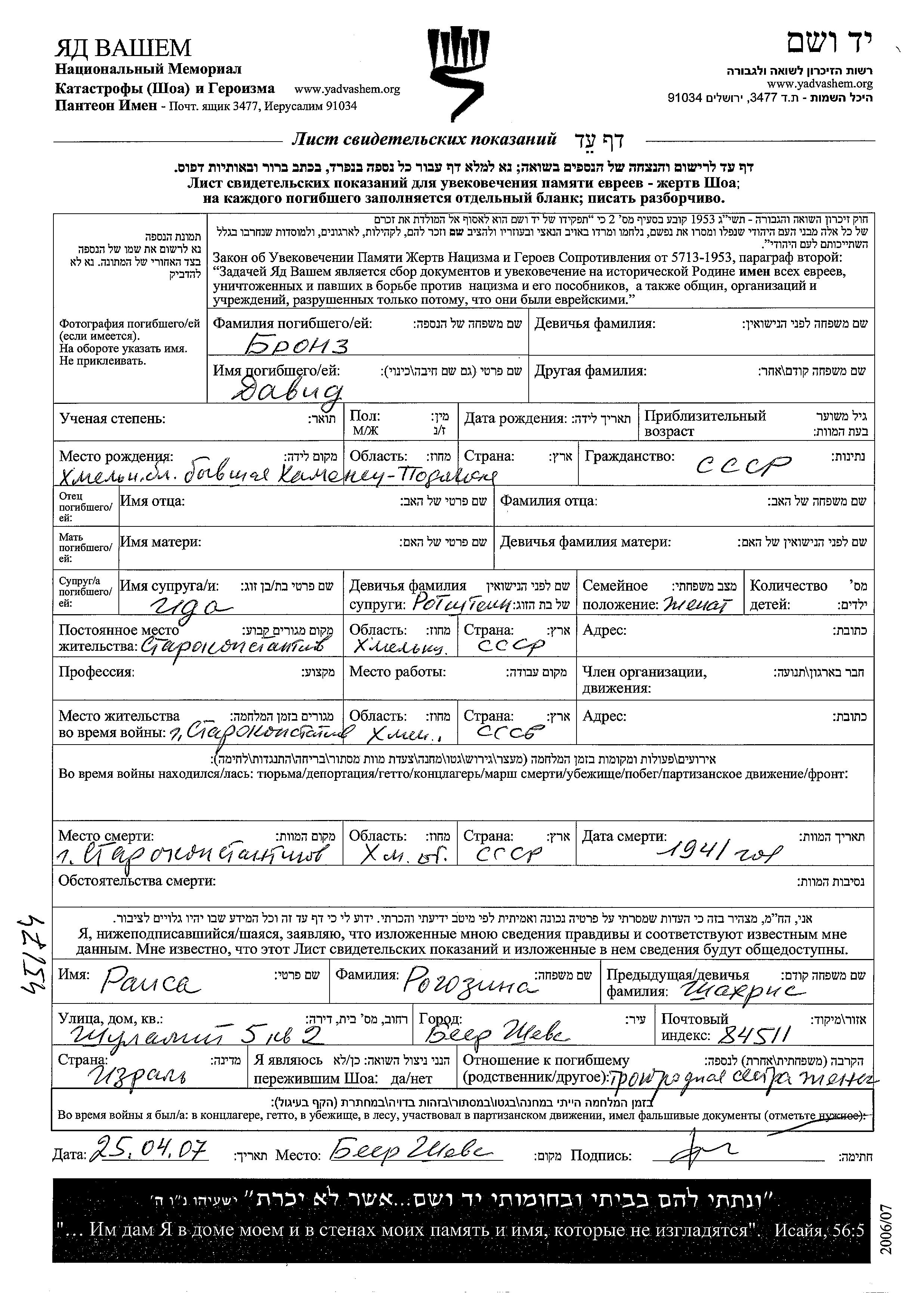 Яд Вашем - Листы свидетельских показаний Мемориального фонда