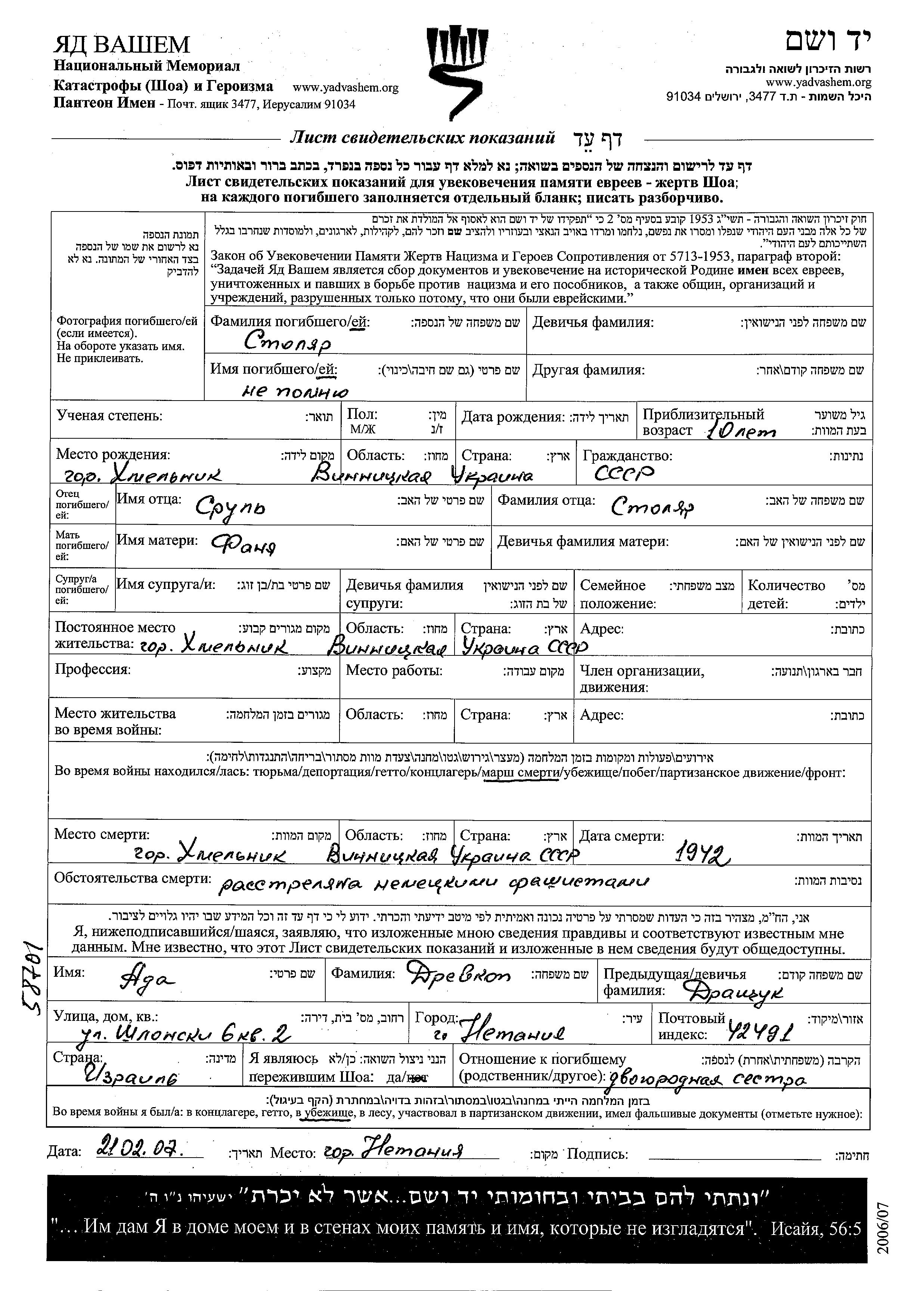 Яд Вашем - Листы свидетельских показаний Мемориального фонда