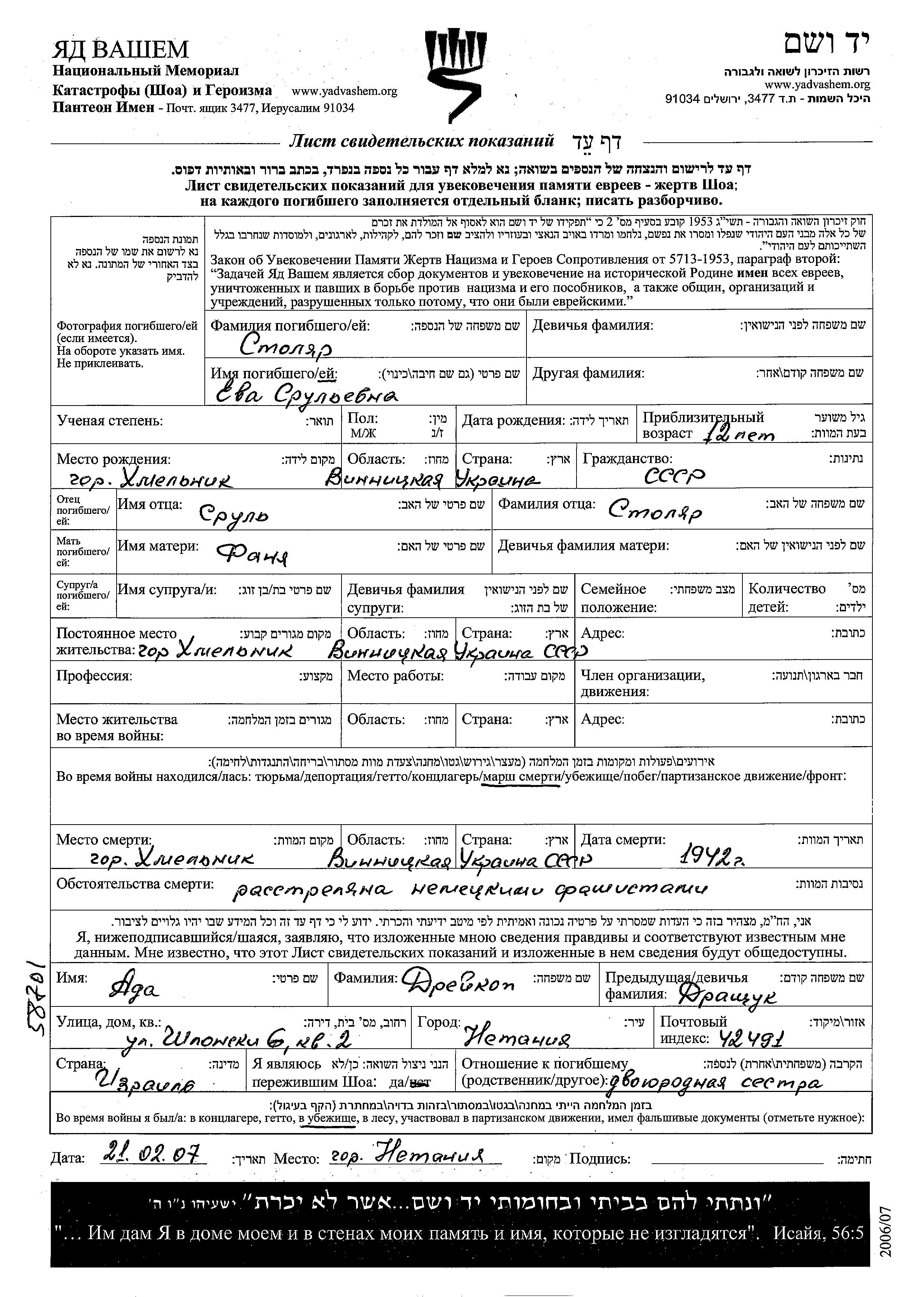 Столяр Ева Хмельник, Украина (СССР) Лист свидетельских показаний