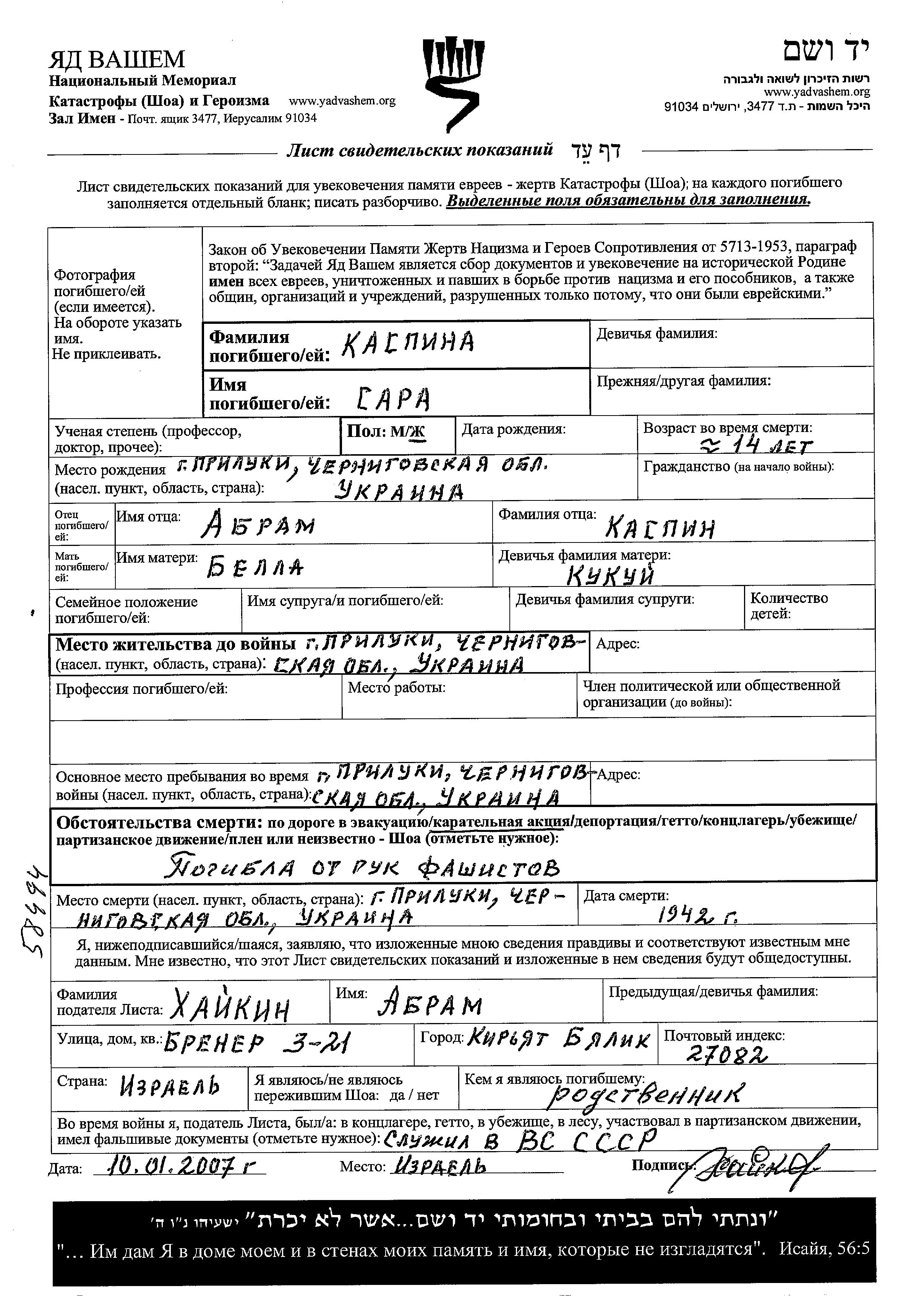 Каспина Сара Прилуки, Украина (СССР) Лист свидетельских показаний