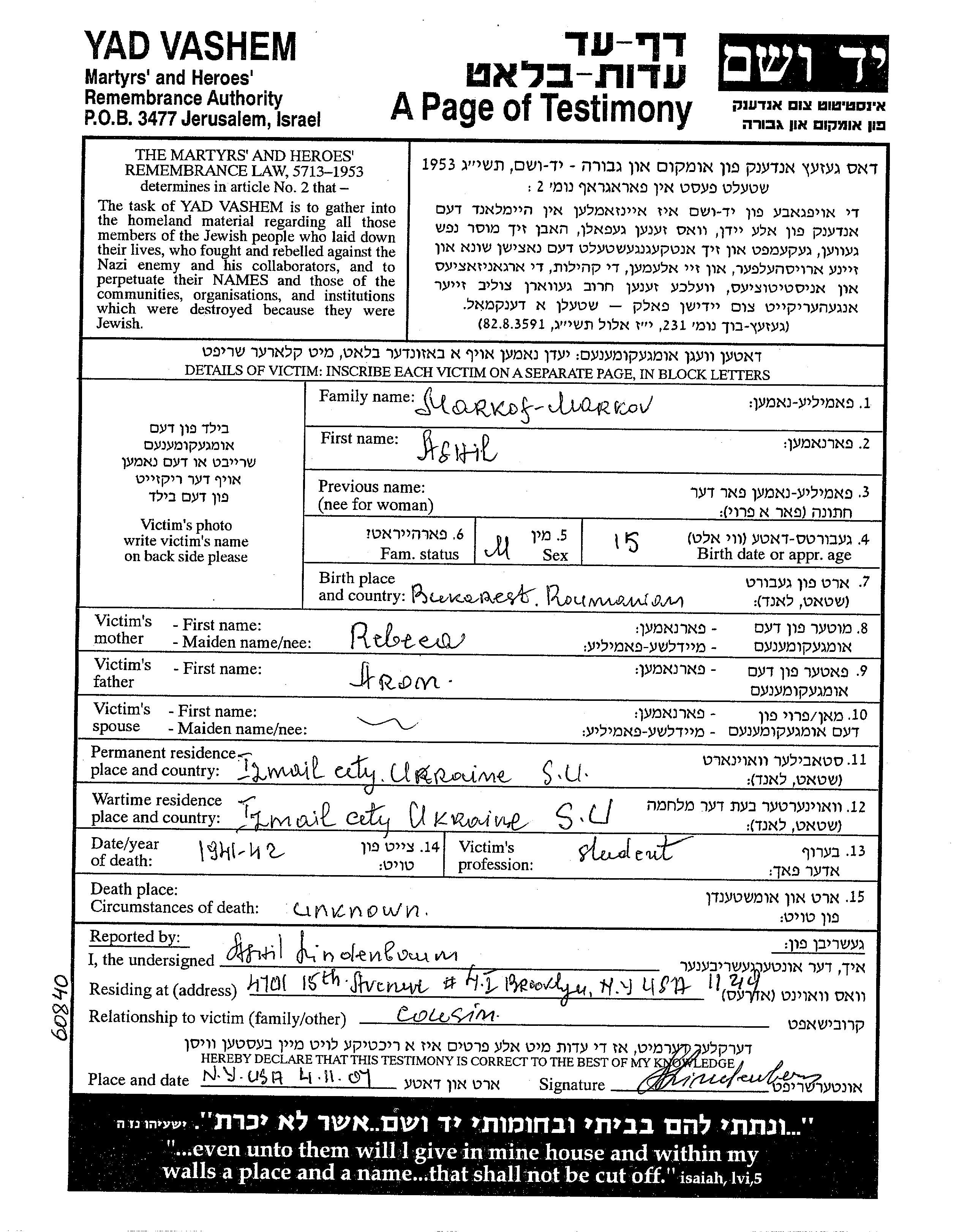 Ашил Марков, место рождения: Бухарест, Румыния. Отец: Арон, mать:Ребека. Студент / студентка. Место жительства до войны: Измаил, Румыния. Место во время войны: Измаил, Румыния.