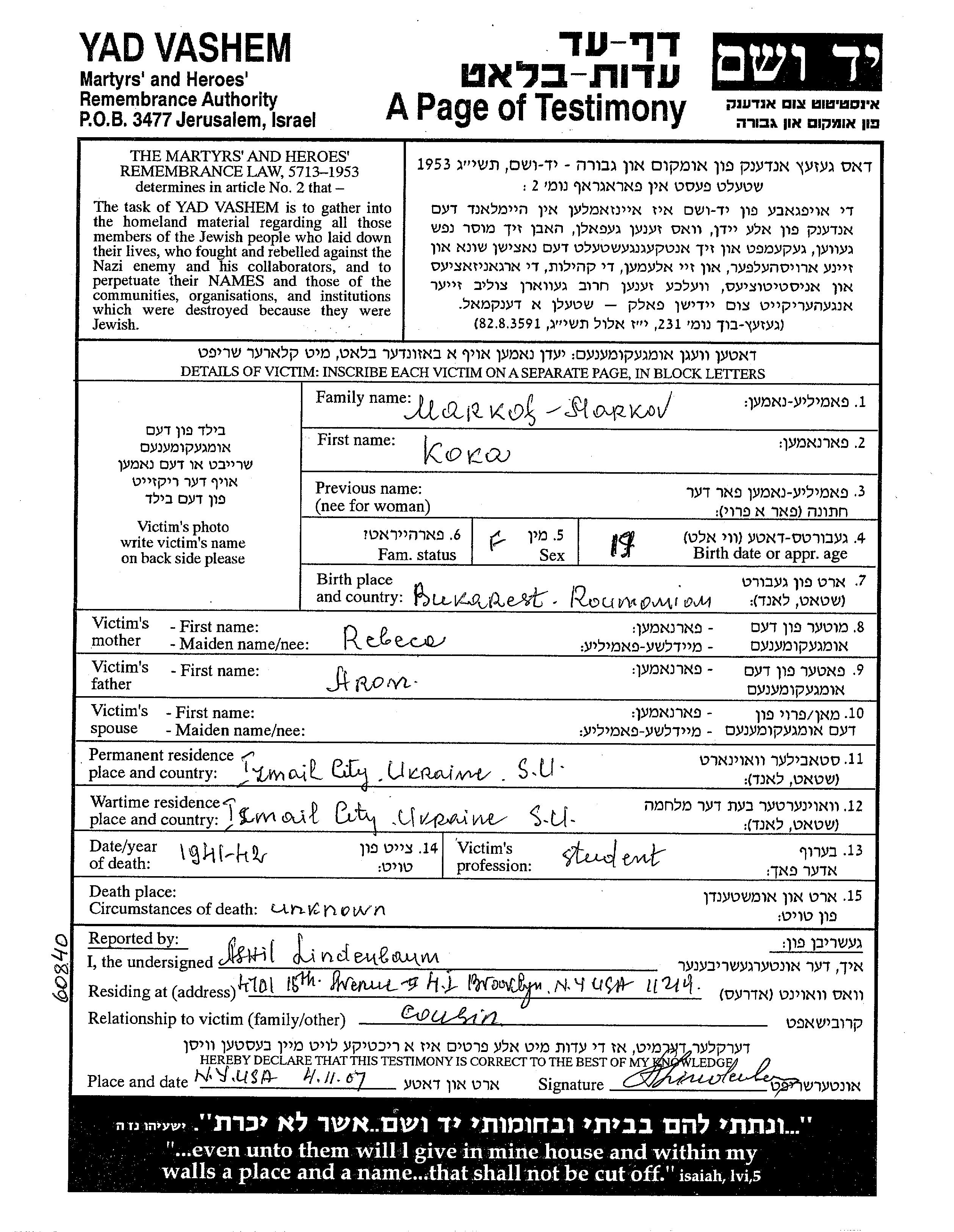 Маркоф Кора Измаил, Румыния Лист свидетельских показаний