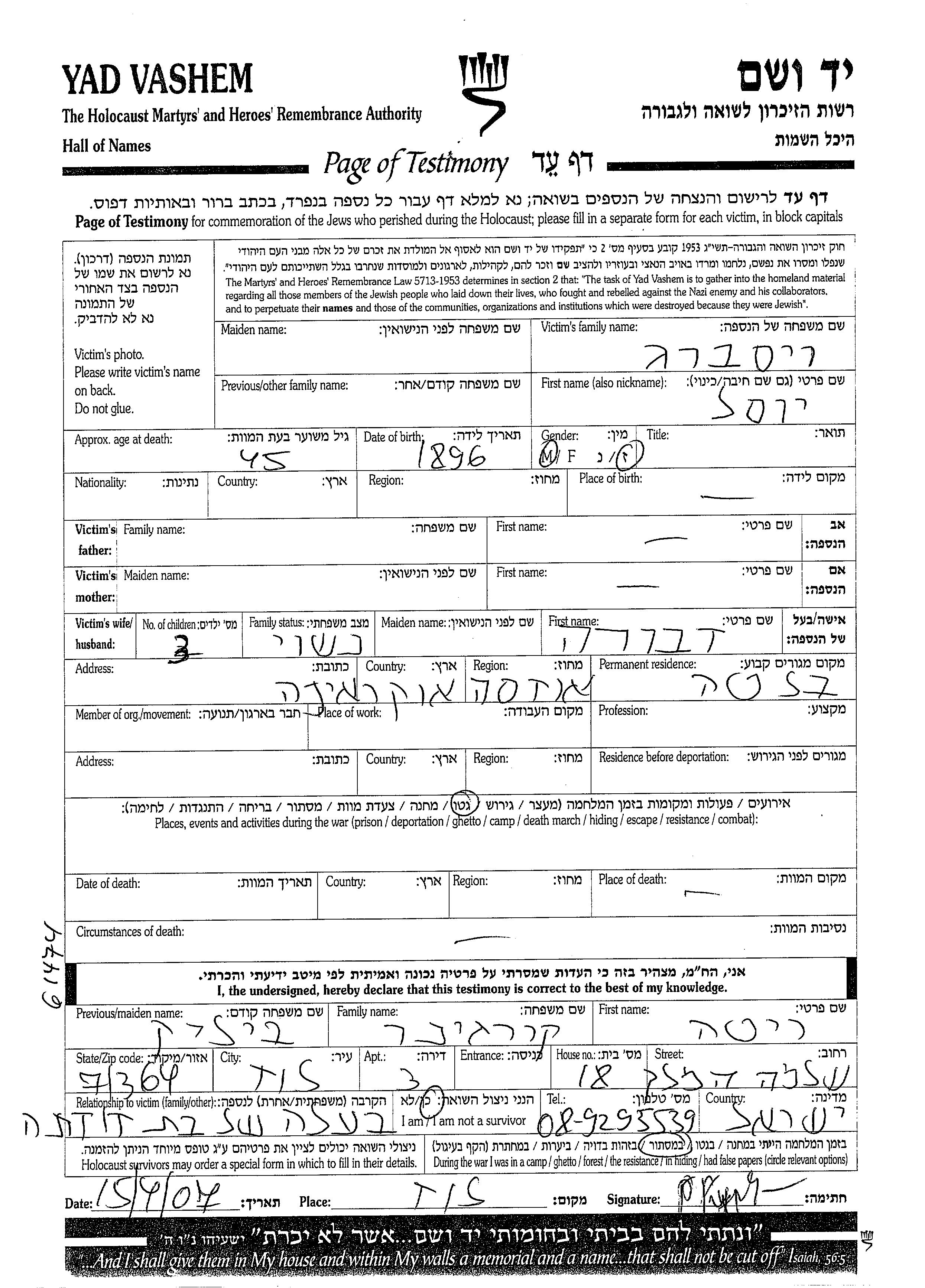 Яд Вашем - Листы свидетельских показаний Мемориального фонда