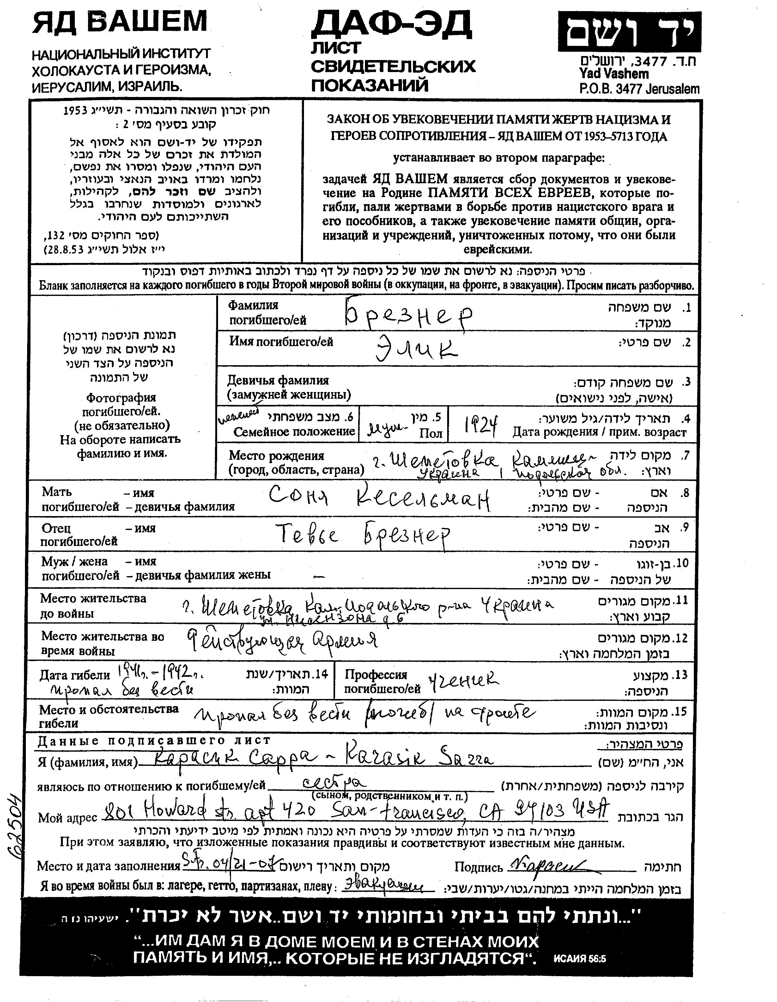 Брезнер Элик 1924 Шепетовка, Украина (СССР) Лист свидетельских показаний