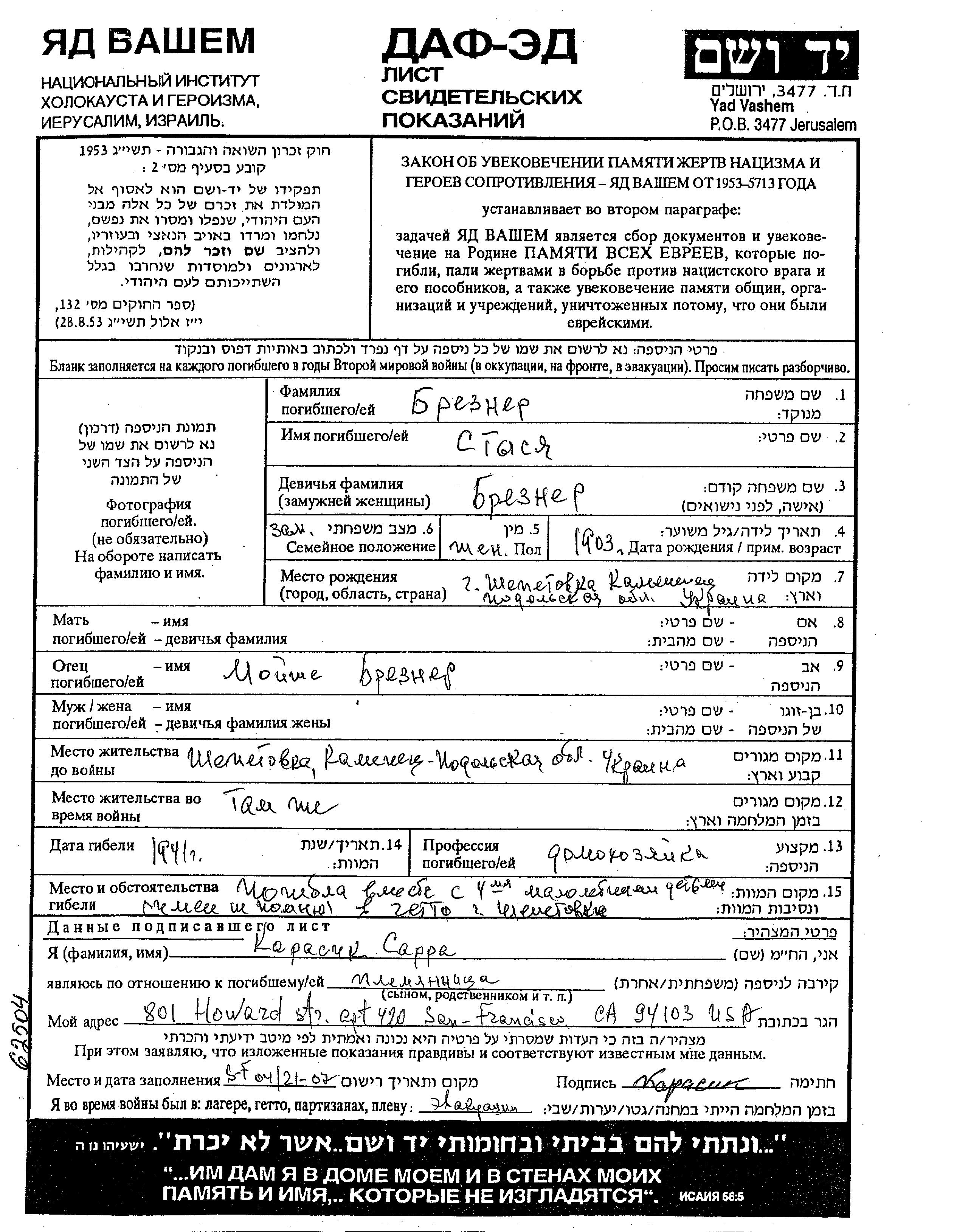 Брезнер Стася 1903 Шепетовка, Украина (СССР) Лист свидетельских показаний