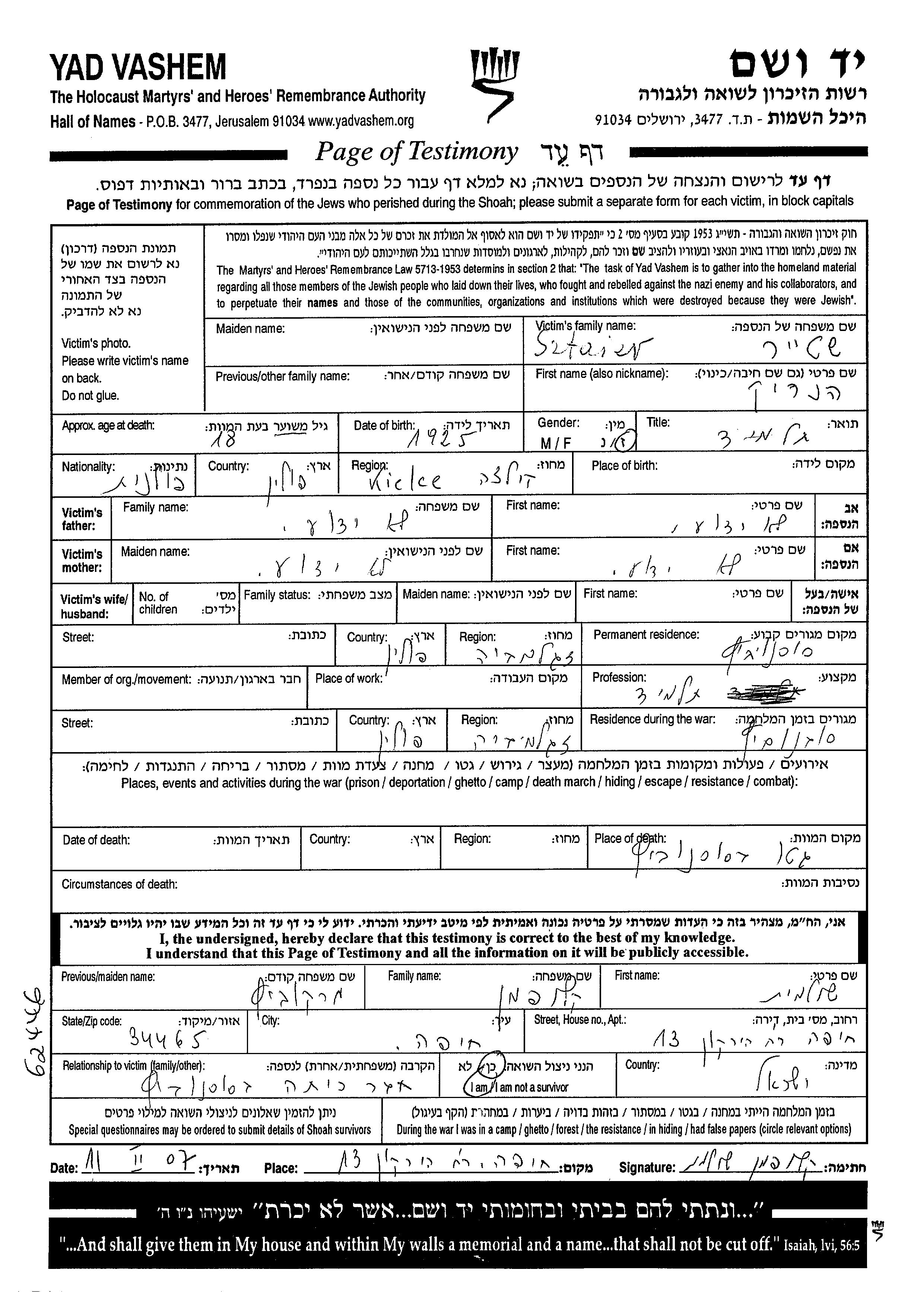 Штайер Хенрик 1925 Сосновец, Польша Лист свидетельских показаний