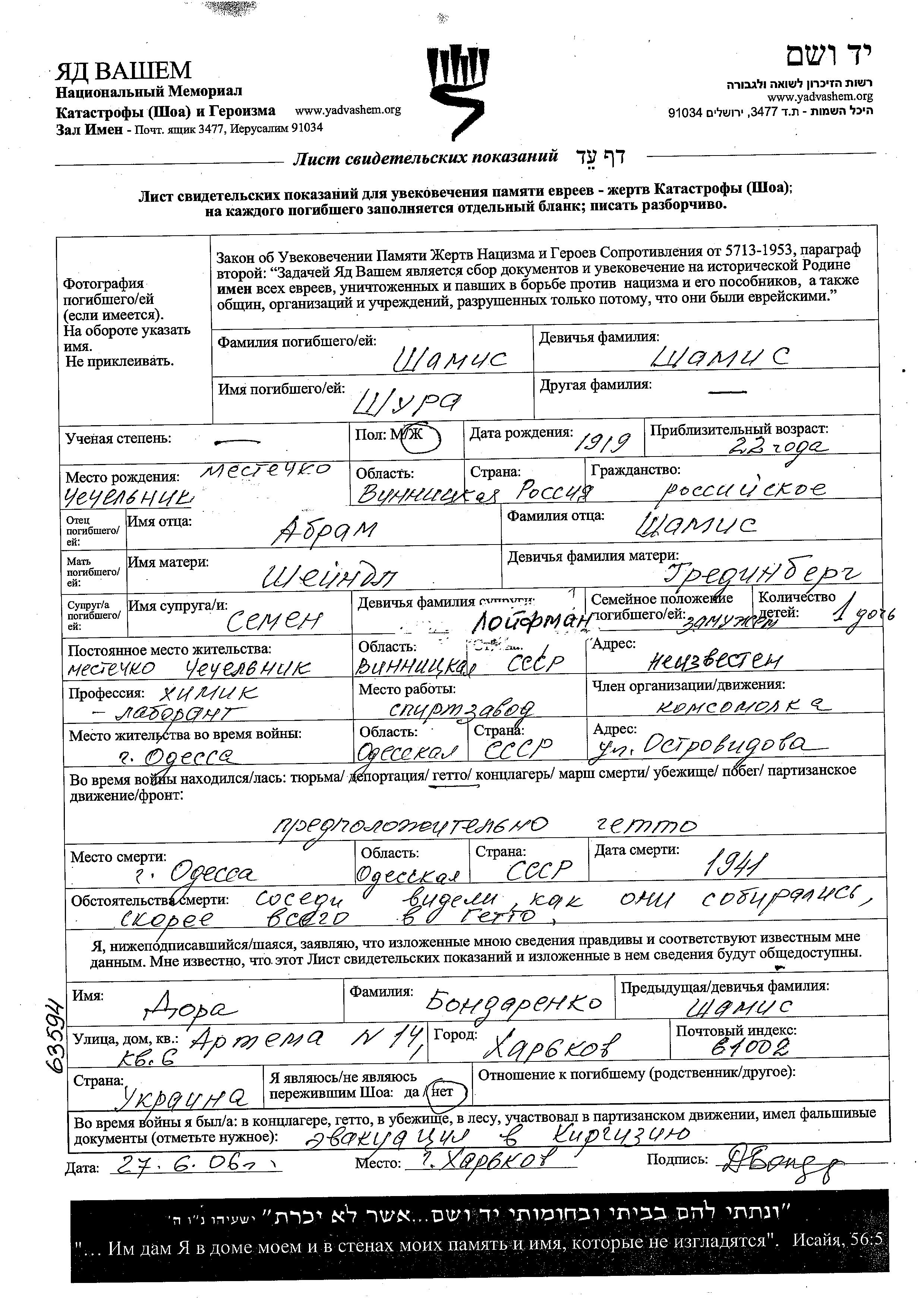 Шамис Шура 1919 Чечельник, Украина (СССР) Лист свидетельских показаний