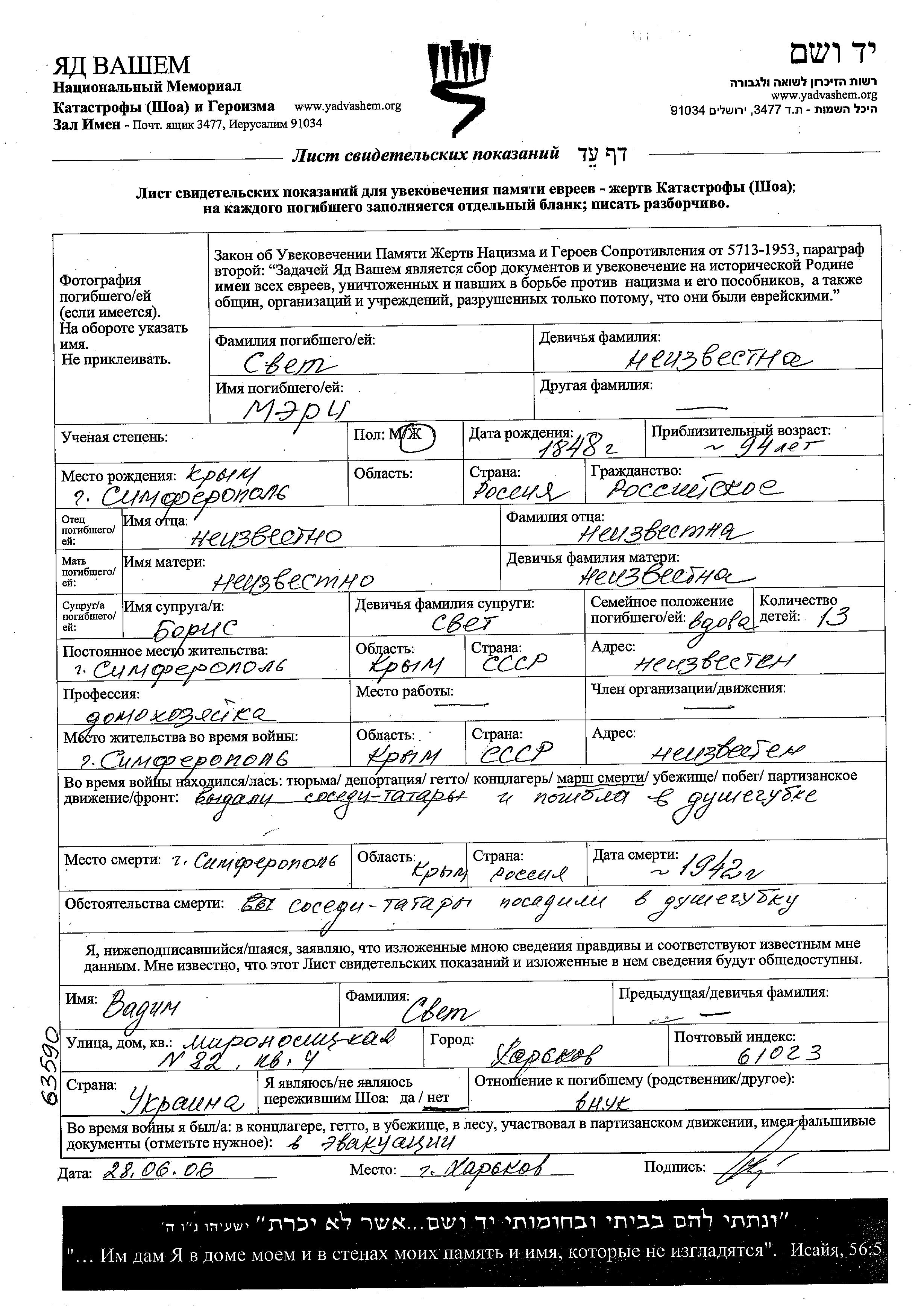 Мери Свет, место рождения: Симферополь, Россия (СССР). Домохозяйка. Вдова. Место жительства до войны: Симферополь, Россия (СССР). Место во время войны: Симферополь, Россия (СССР).