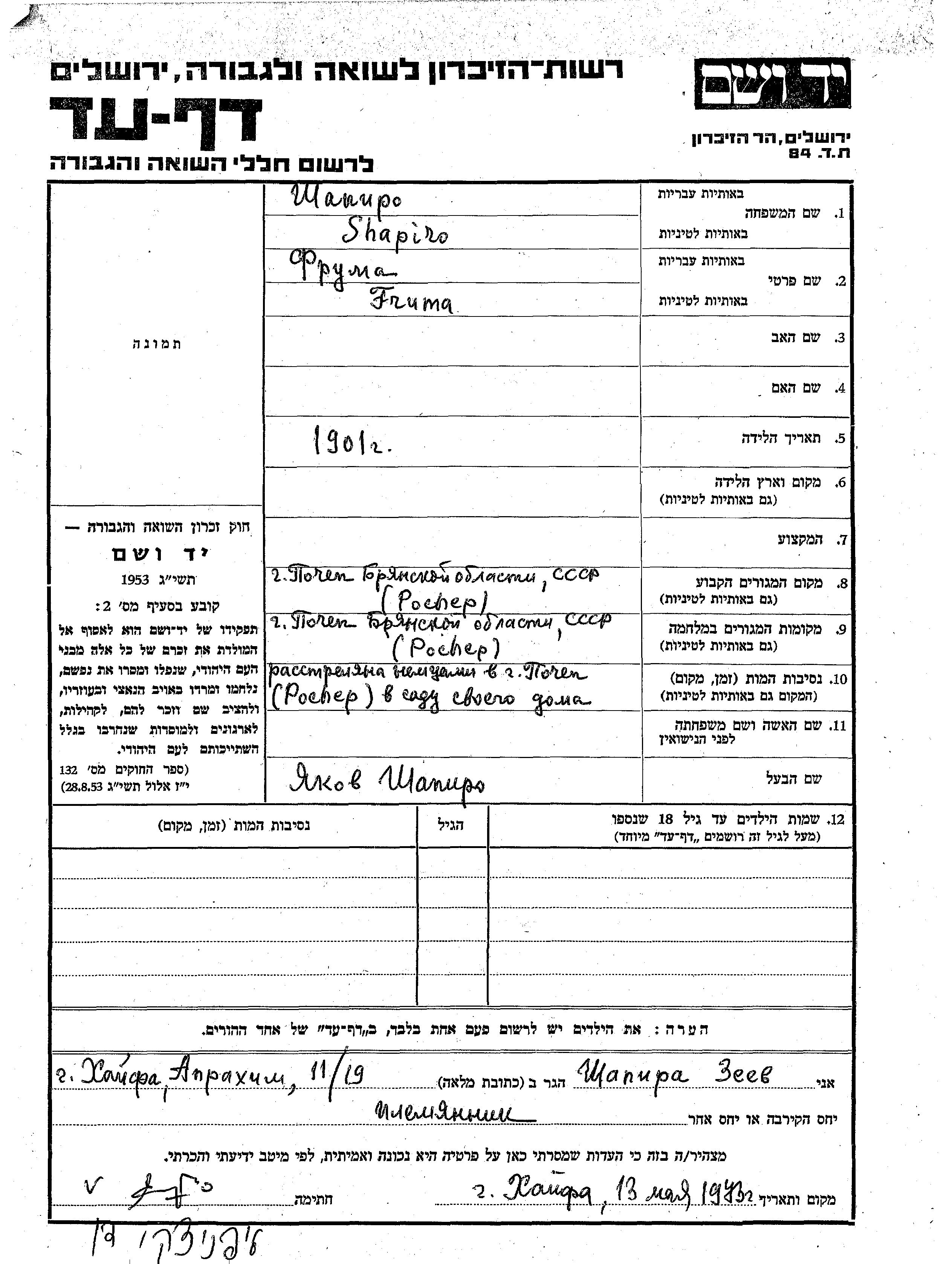 Шапиро Фрума 1901 Почеп, Россия (СССР) Лист свидетельских показаний