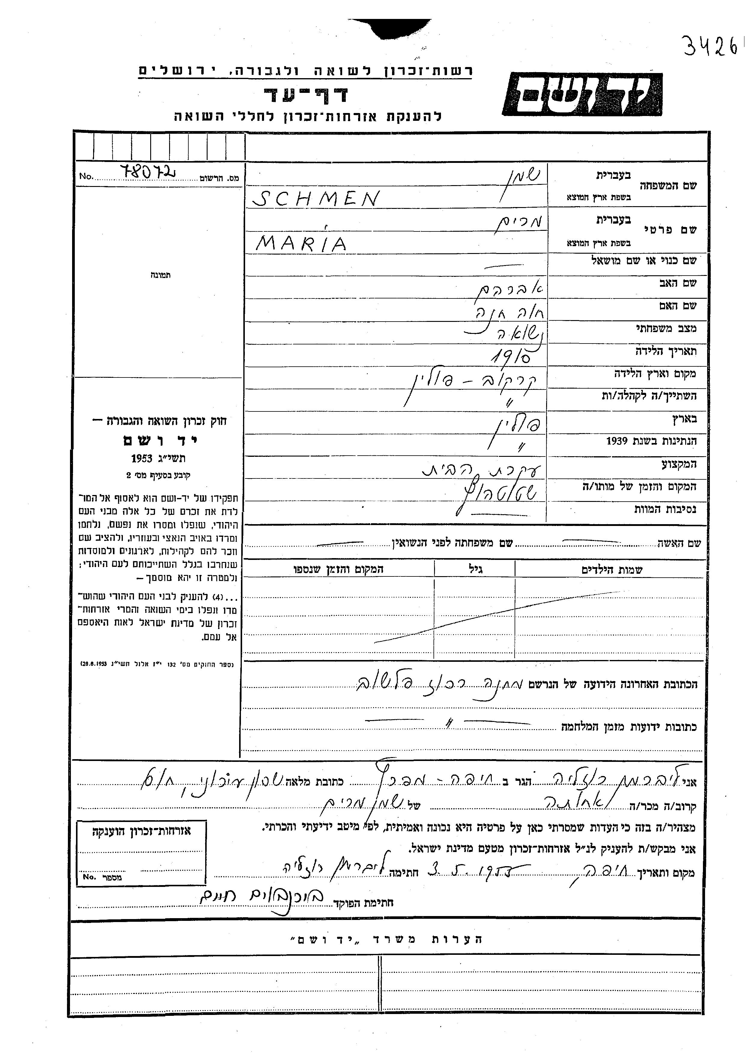 Мария Мирьям Шмен, место рождения: Краков, Польша. Отец: Авраам, mать:Хава Хана. Домохозяйка. Женат / замужем. Место жительства до войны: Краков, Польша. Место во время войны: Плашув, Польша.