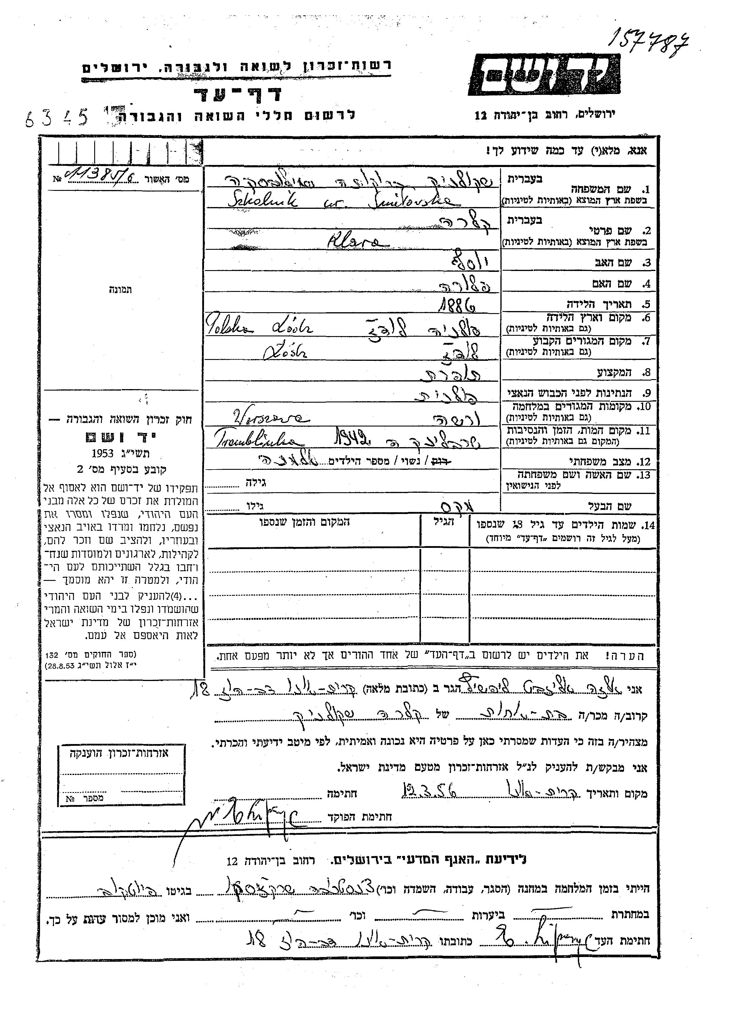 Школьник Клара 1886 Лодзь, Польша Лист свидетельских показаний