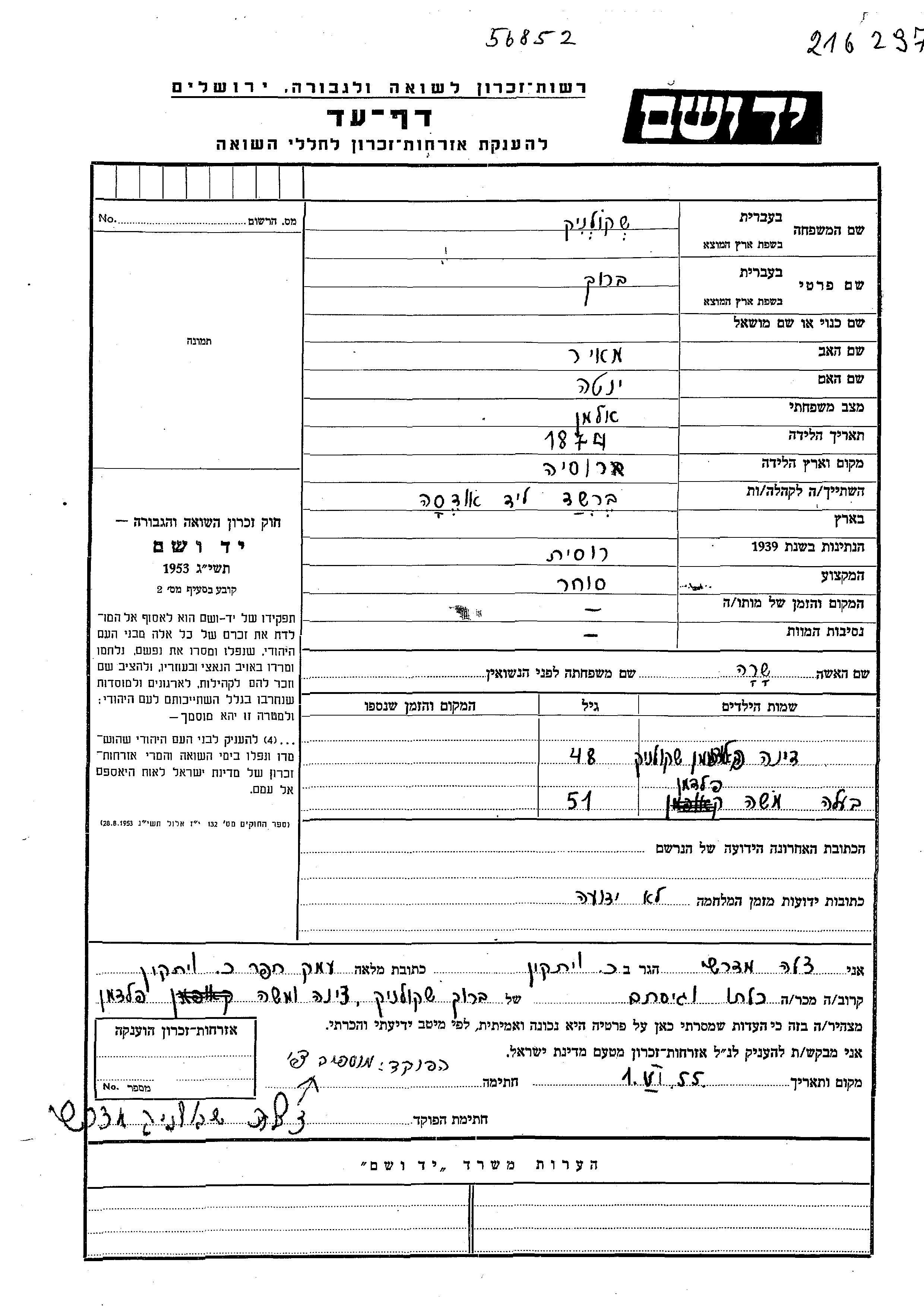 Барух Школьник, место рождения: Россия (СССР). Отец: Меир, mать:Ента. Торговец / торговка. Вдовец. Место жительства до войны: Бершадь, Украина (СССР).