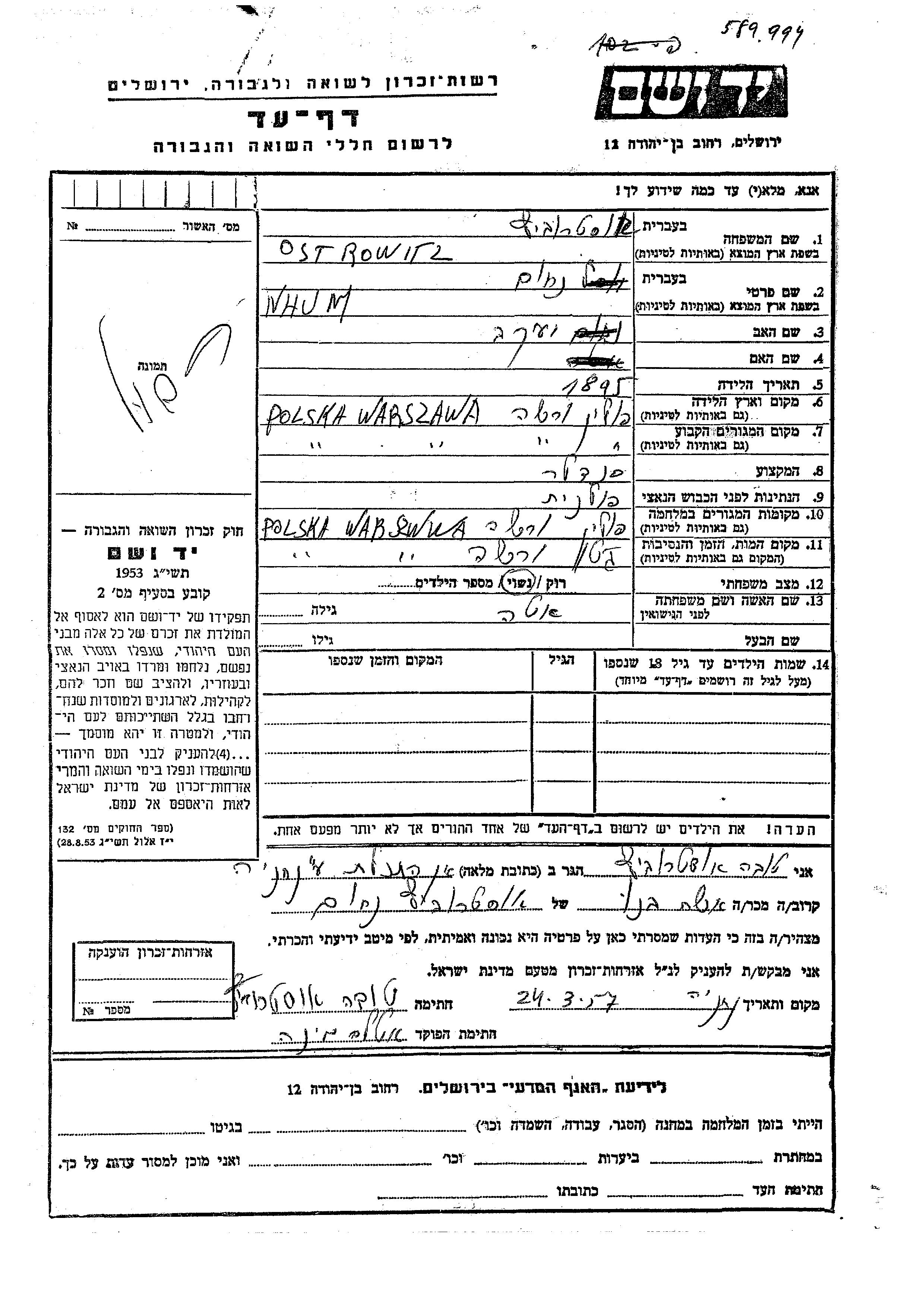 Нахум Островиц, место рождения: Варшава, Польша. Отец: Яков. Сапожник. Женат / замужем. Место жительства до войны: Варшава, Польша. Место во время войны: Варшава, Польша.