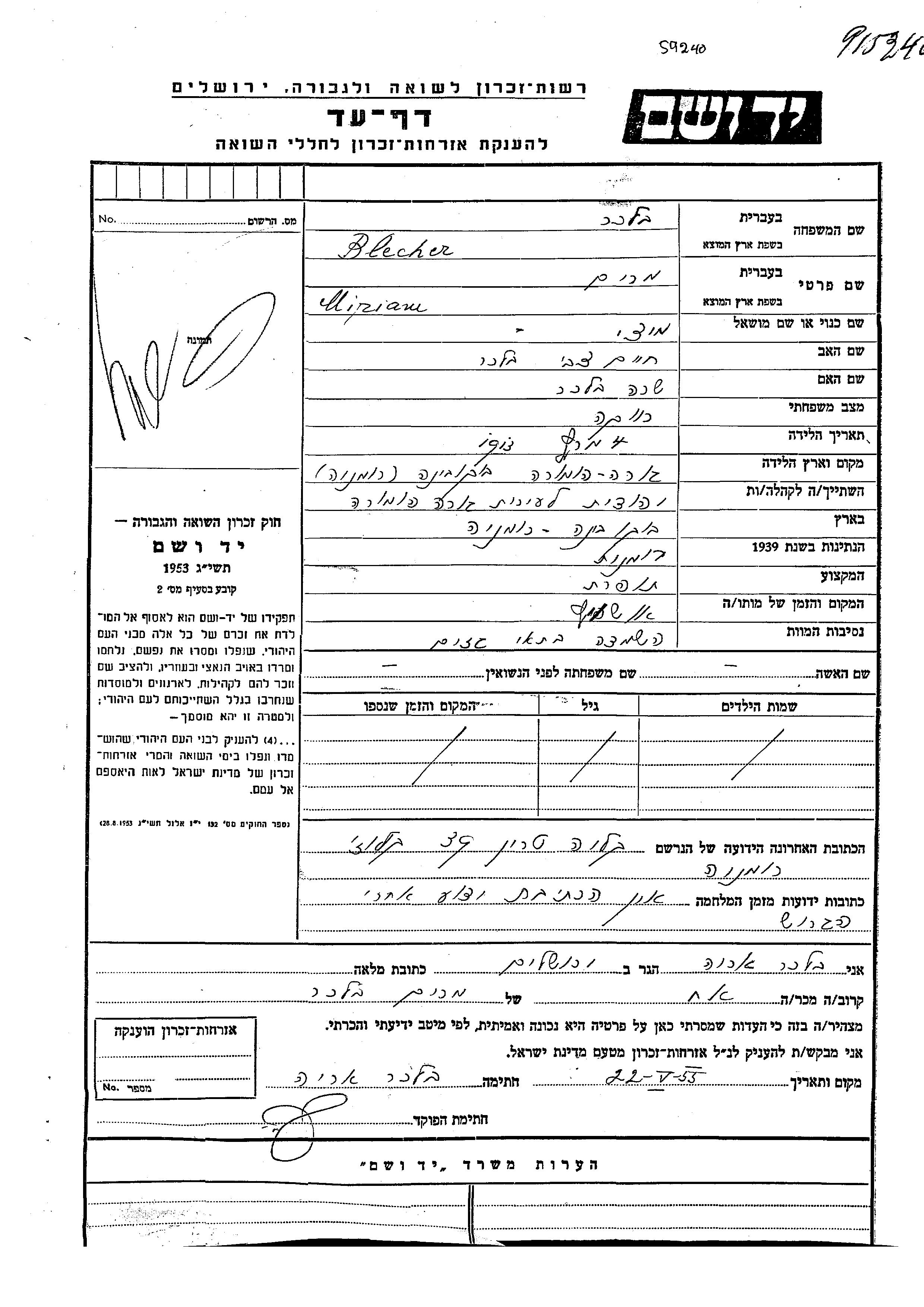 Блехер Мирьям 1913 Гура-Хуморулуй, Румыния Лист свидетельских показаний