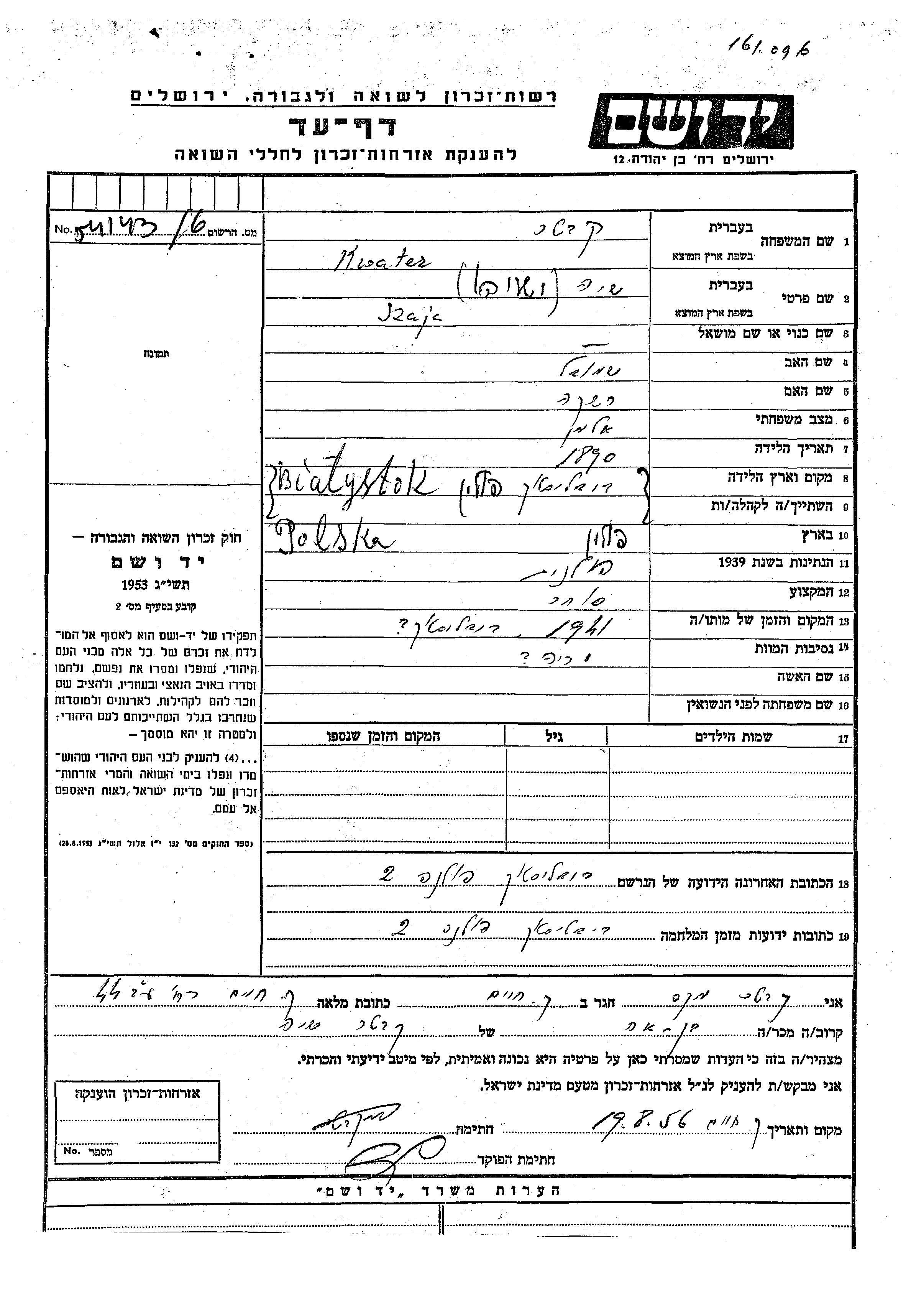 Шая Кватер, место рождения: Белосток, Польша. Отец: Шмуэль, mать:Рашка. Торговец / торговка. Вдовец. Место жительства до войны: Белосток, Польша. Место во время войны: Белосток, Польша.
