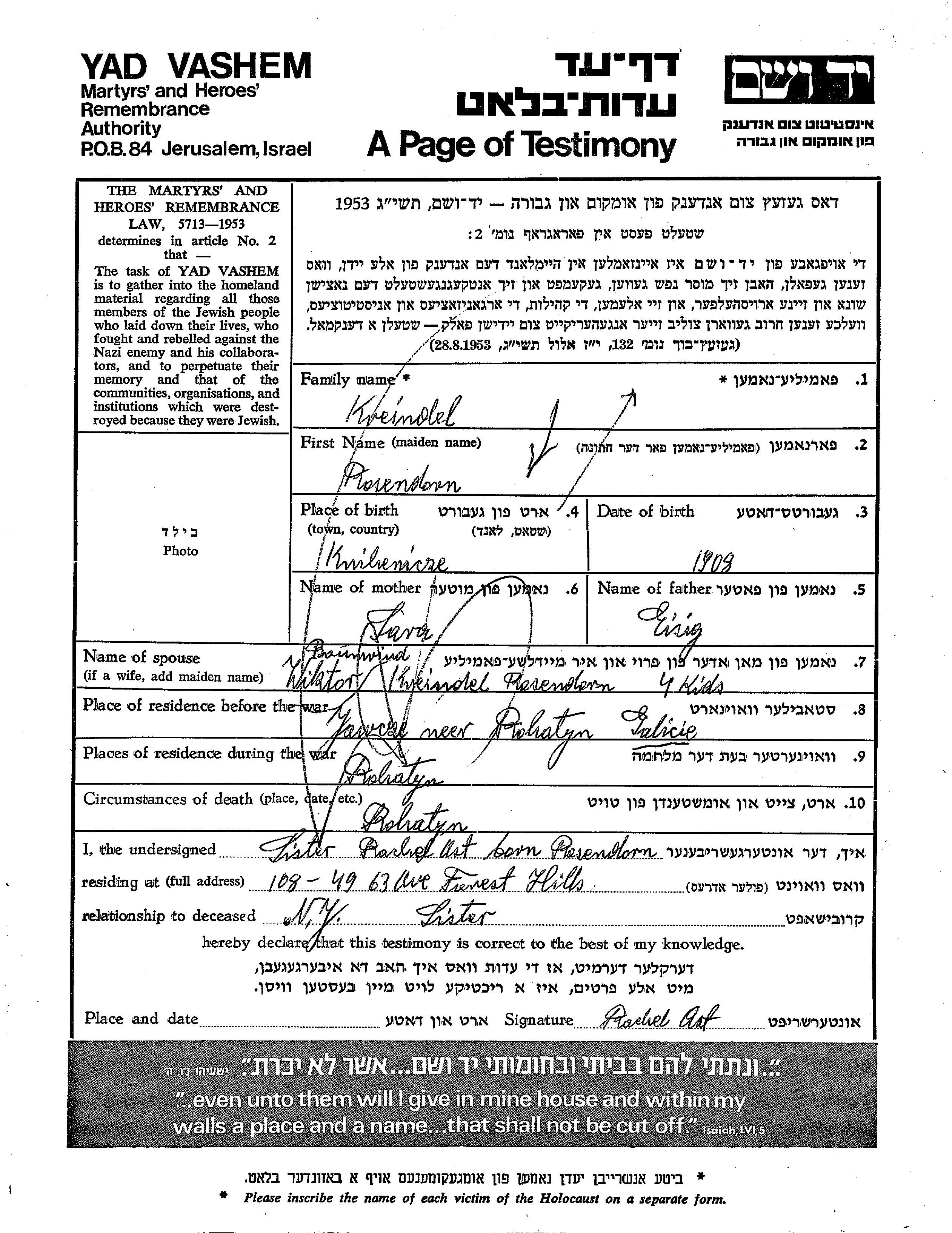 Розендорн Крейндель 1908 Явче, Польша Лист свидетельских показаний
