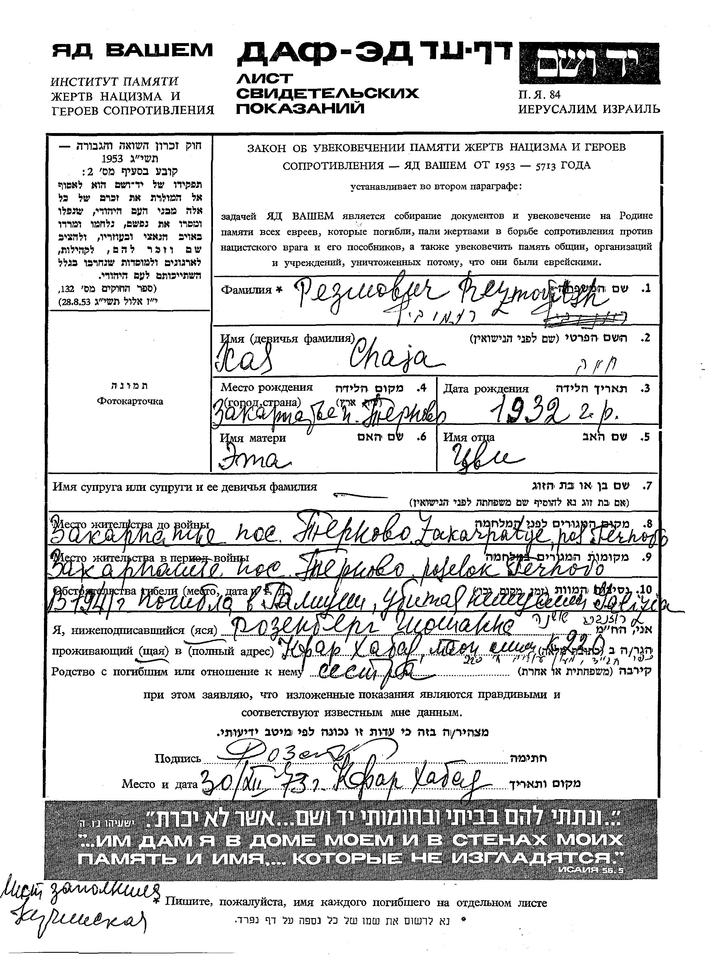 Резмович Хая 1932 Терново, Чехословакия Лист свидетельских показаний