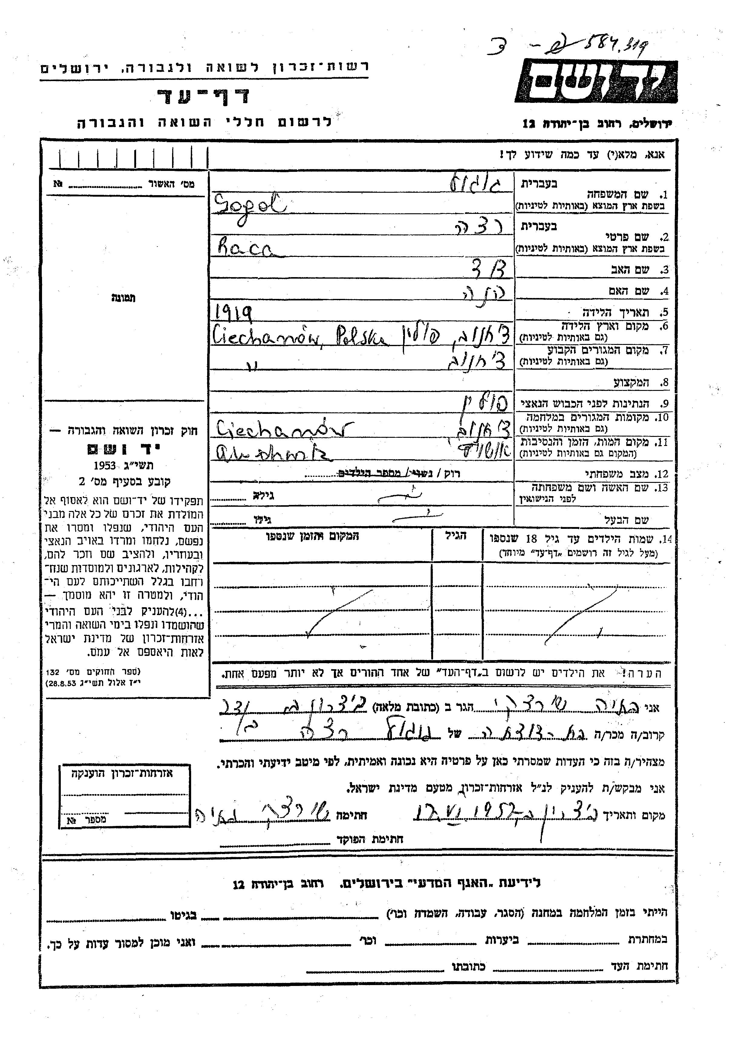 Раца Гоголь, место рождения: Цеханув, Польша. Отец: Давид, mать:Хена. Холост / не замужем. Место жительства до войны: Цеханув, Польша. Место во время войны: Цеханув, Польша.