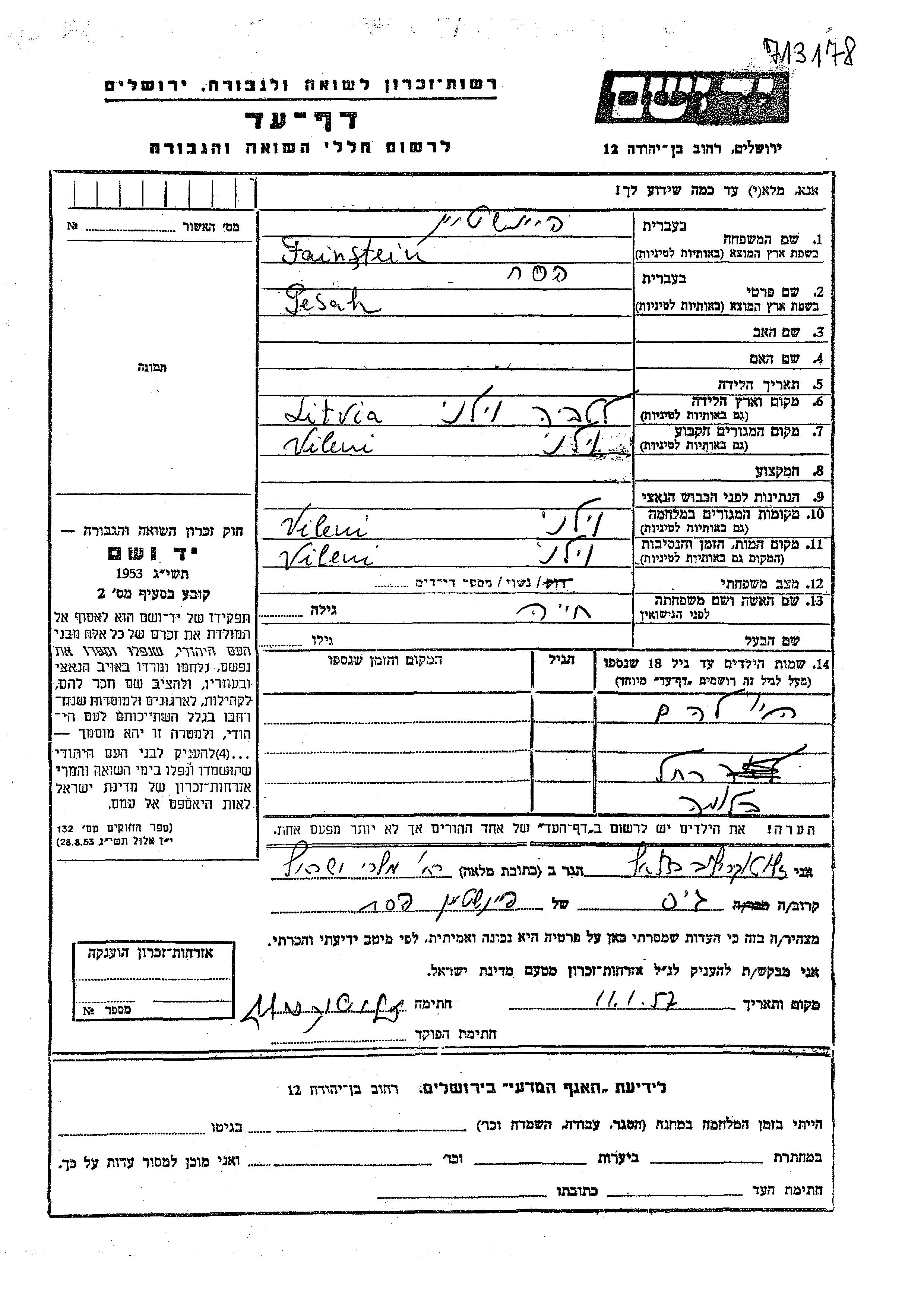 Песах Файнштейн, место рождения: Вилени, Латвия. Женат / замужем. Место жительства до войны: Вилени, Латвия. Место во время войны: Вилени, Латвия.
