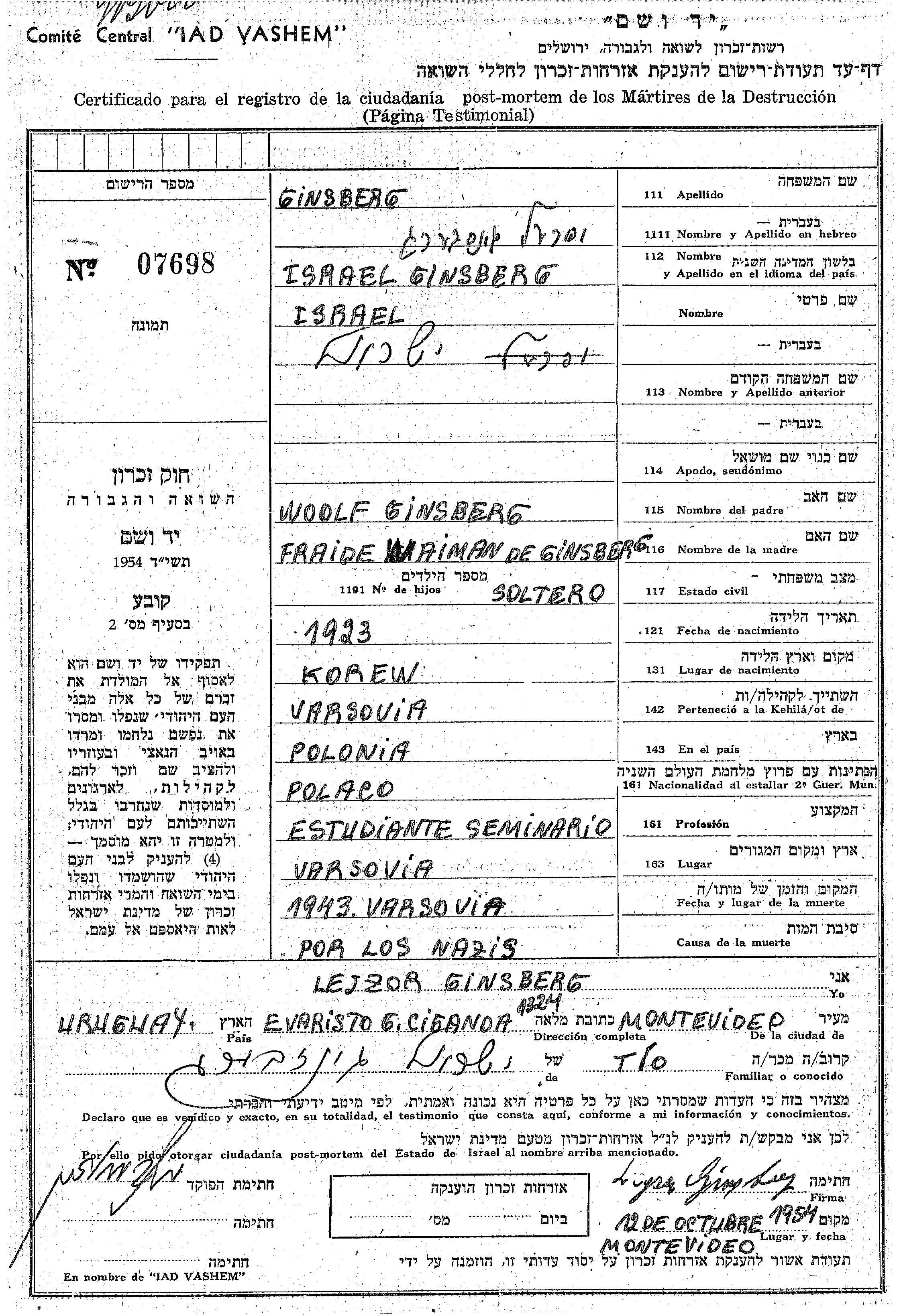 Исраэль Гинсберг, место рождения: Корев, Польша. Отец: Вульф, mать:Фрайде. Студент / студентка. Холост / не замужем. Место жительства до войны: Варшава, Польша. Место во время войны: Варшава, Польша.