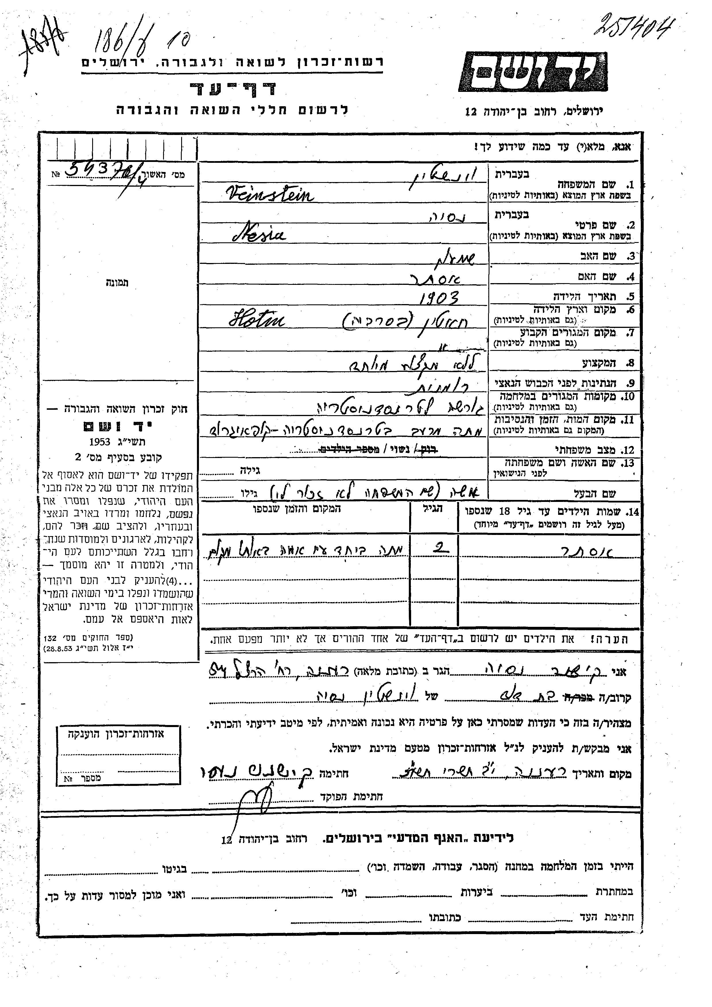 Неся Вейнштейн, место рождения: Хотин, Румыния. Отец: Шимон, mать:Эстер. Женат / замужем. Место жительства до войны: Хотин, Румыния. Место во время войны: Транснистрия, Украина (СССР).