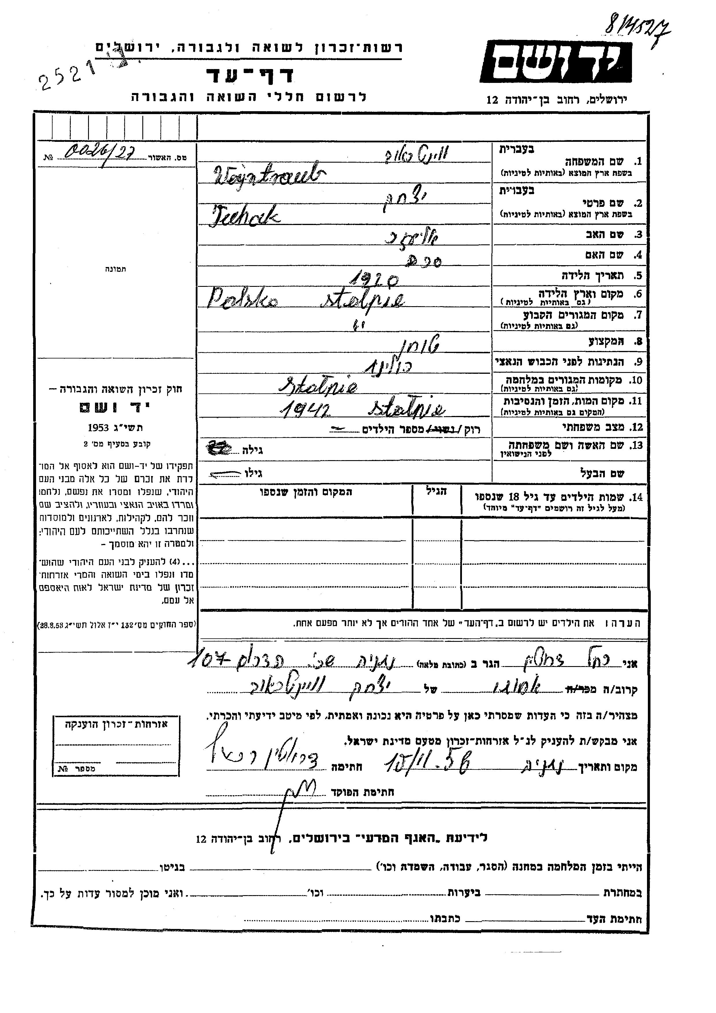 Яд Вашем - Листы свидетельских показаний Мемориального фонда