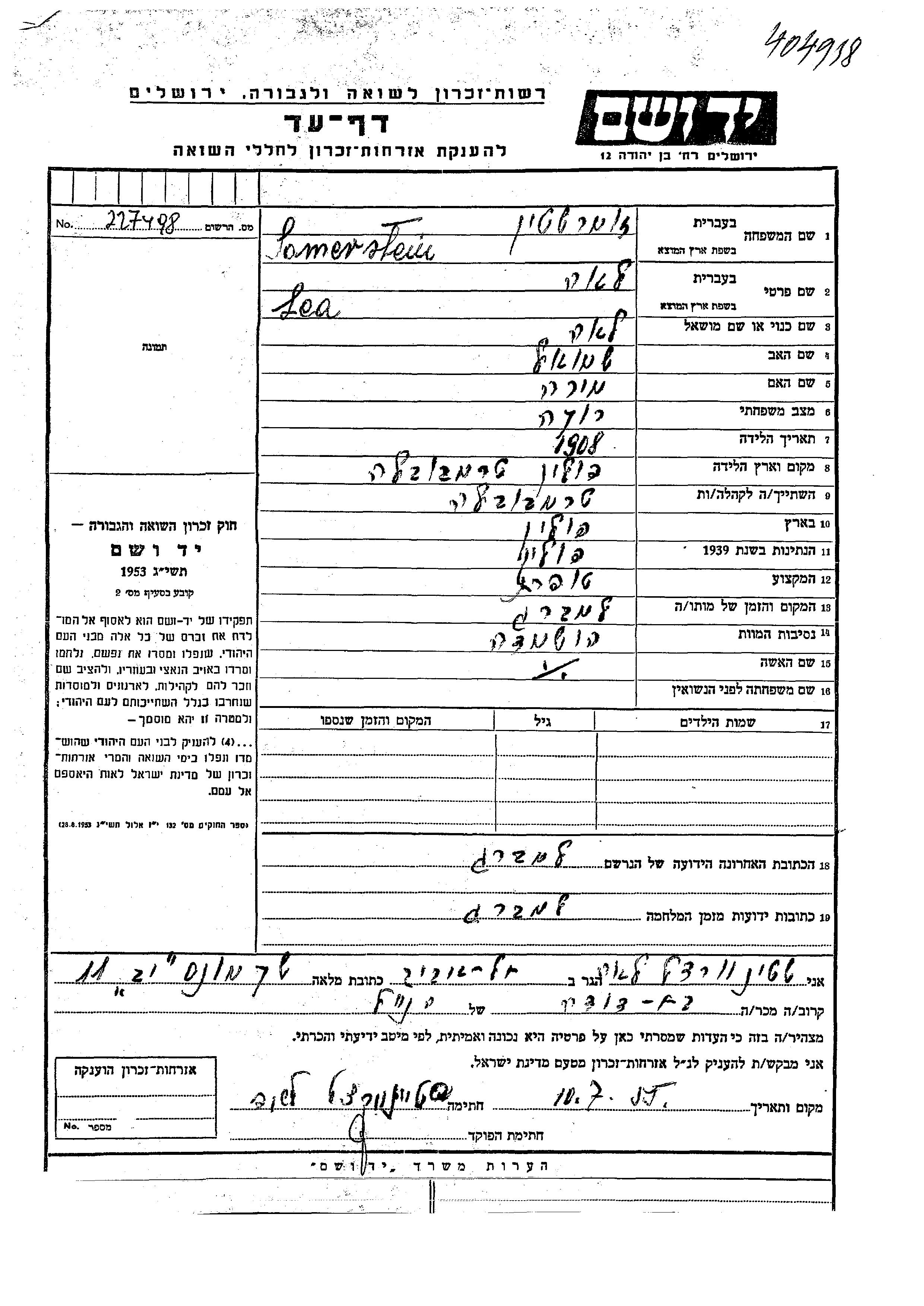 Лея Зомерштайн, место рождения: Трембовль, Польша. Отец: Шмуэль, mать:Мира. Швея. Холост / не замужем. Место жительства до войны: Трембовль, Польша. Место во время войны: Лемберг, Польша.