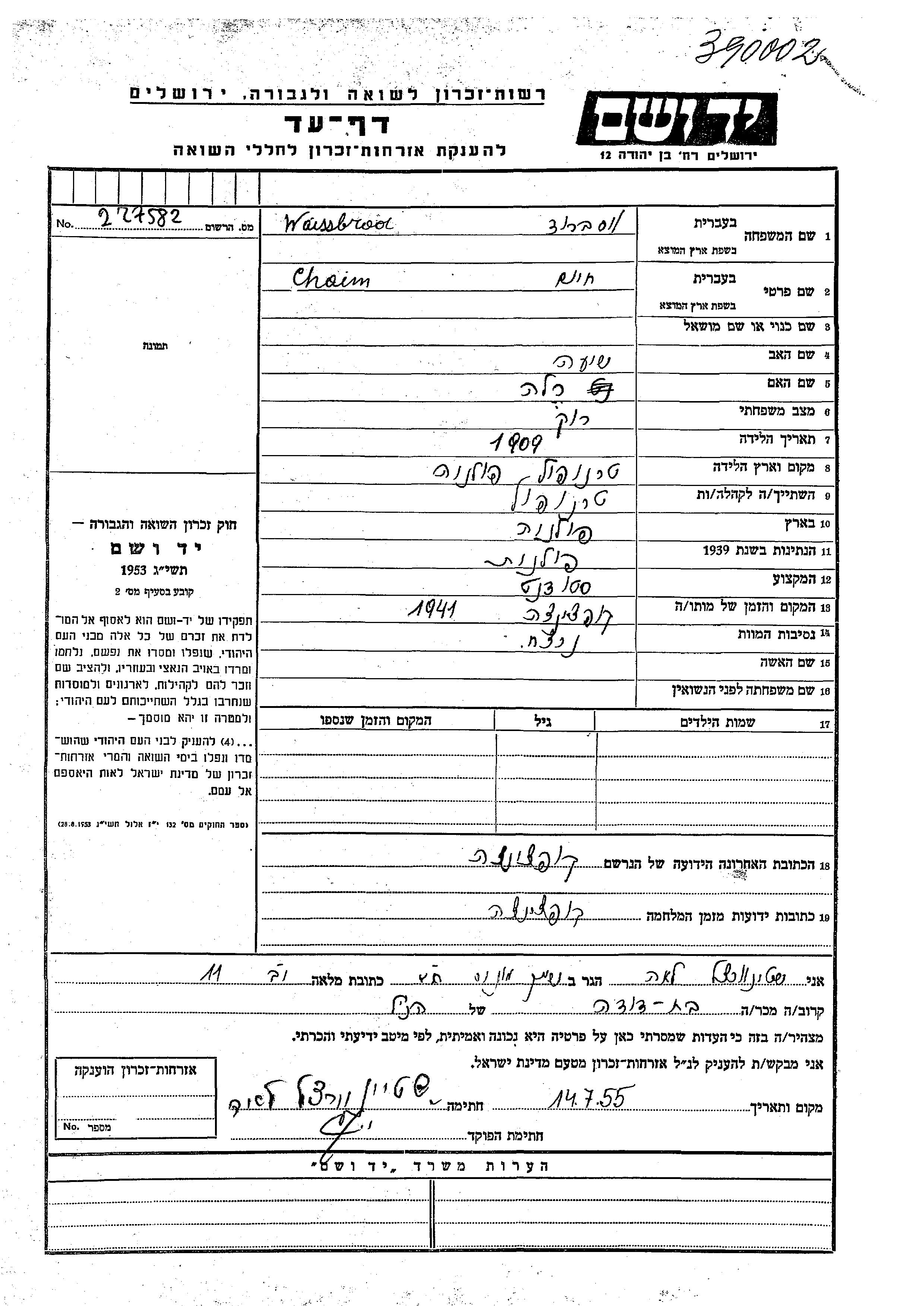 Вайссброд Хаим 1909 Тарнополь, Польша Лист свидетельских показаний