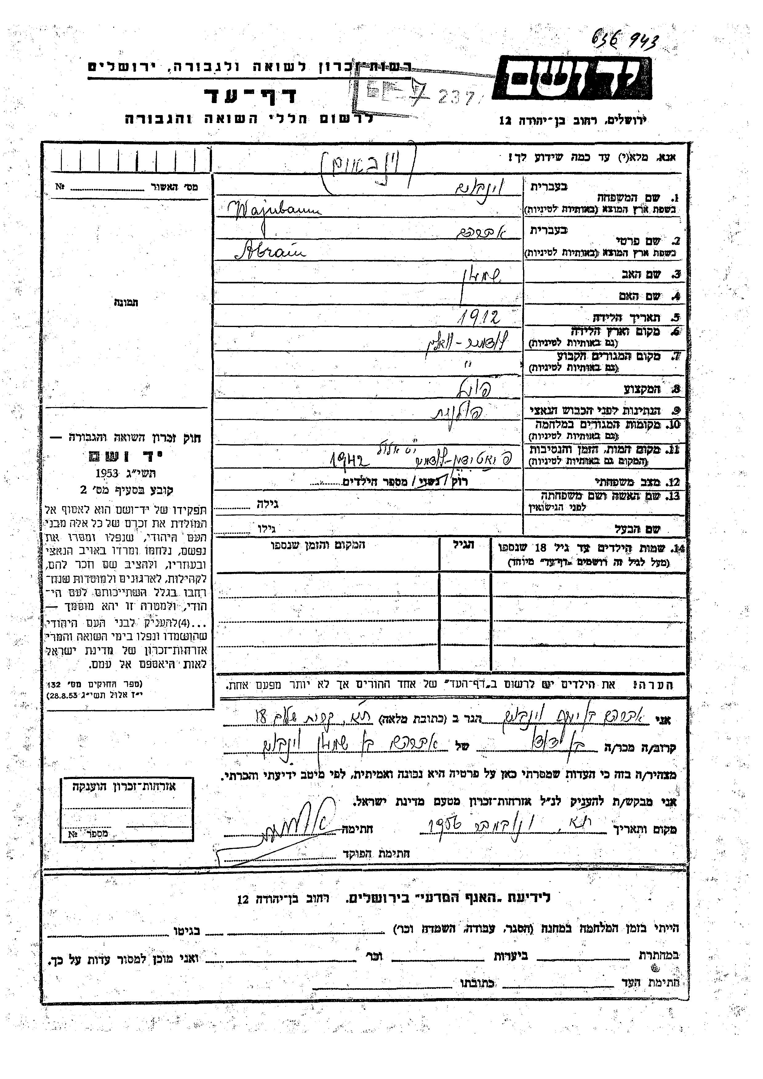 Вайнбаум Абрам 1912 Людмир, Польша Лист свидетельских показаний