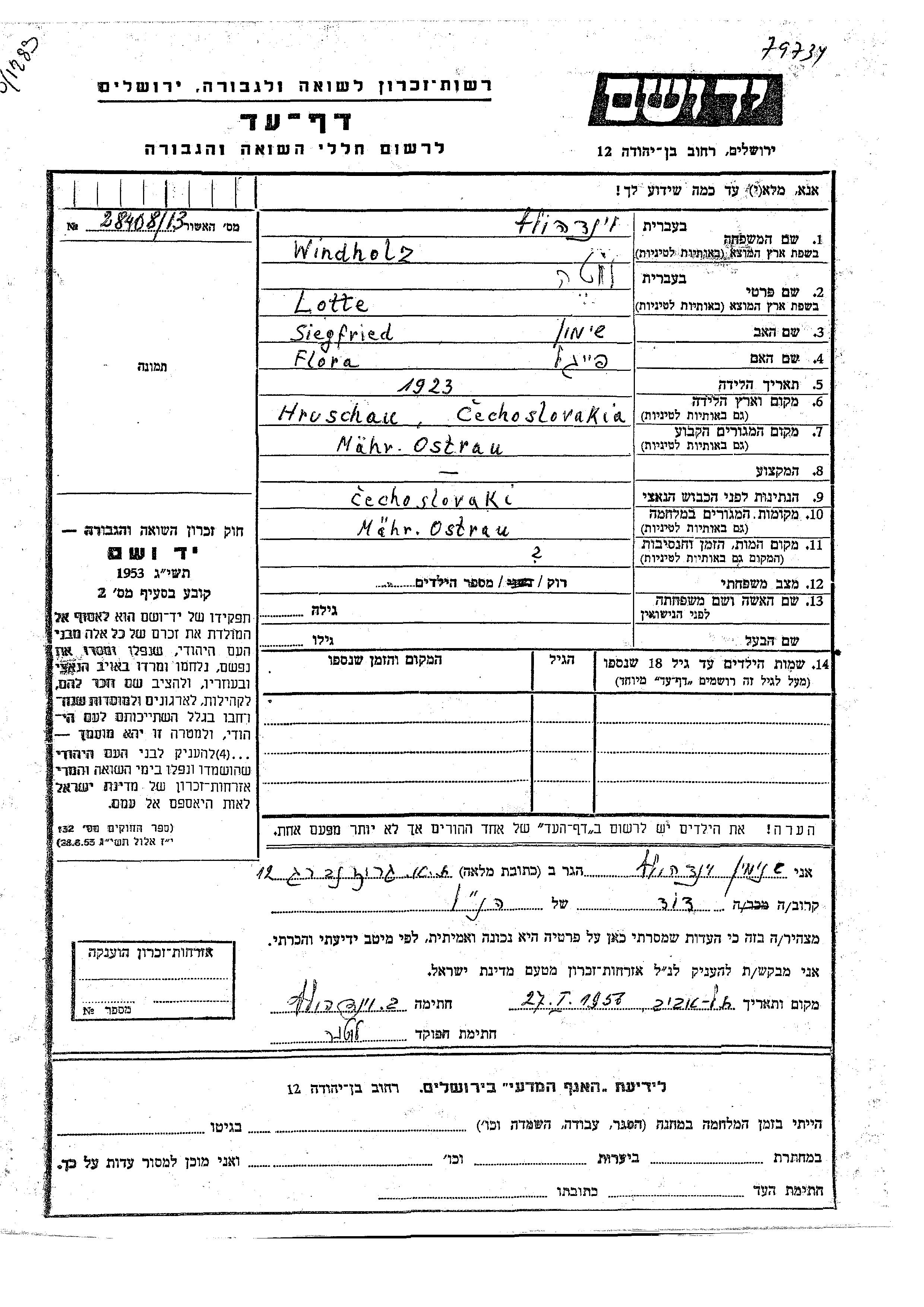 Лотте Виндхольц, место рождения: Хрушау, Чехословакия. Отец: Зигфрид Шимон, mать:Флора Файгель. Холост / не замужем. Место жительства до войны: Хрушау, Чехословакия. Место во время войны: Хрушау, Чехословакия.