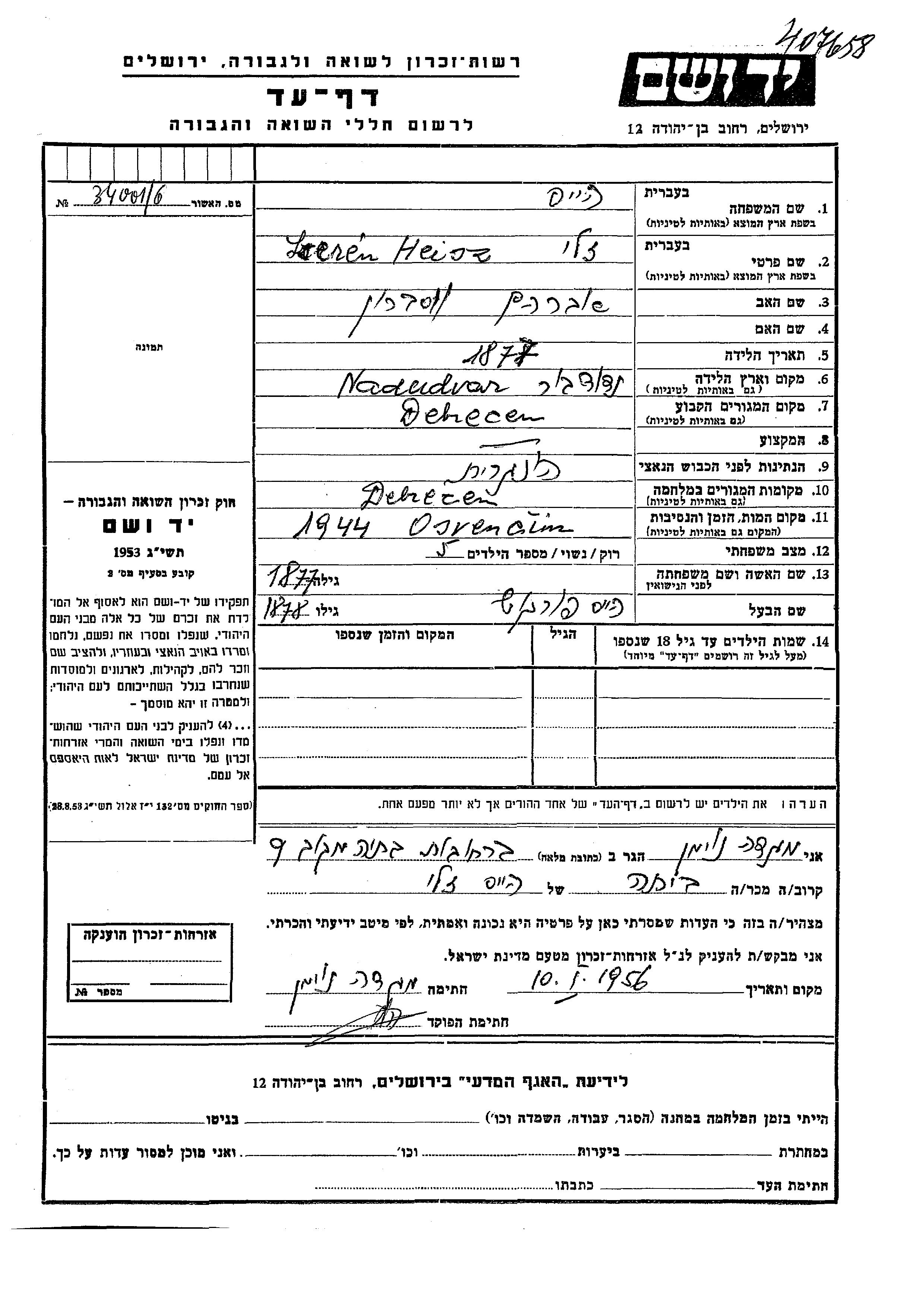 Зелин Зали Хейс, место рождения: Надудвар, Венгрия. Отец: Авраам. Женат / замужем. Место жительства до войны: Дебрецен, Венгрия. Место во время войны: Дебрецен, Венгрия.