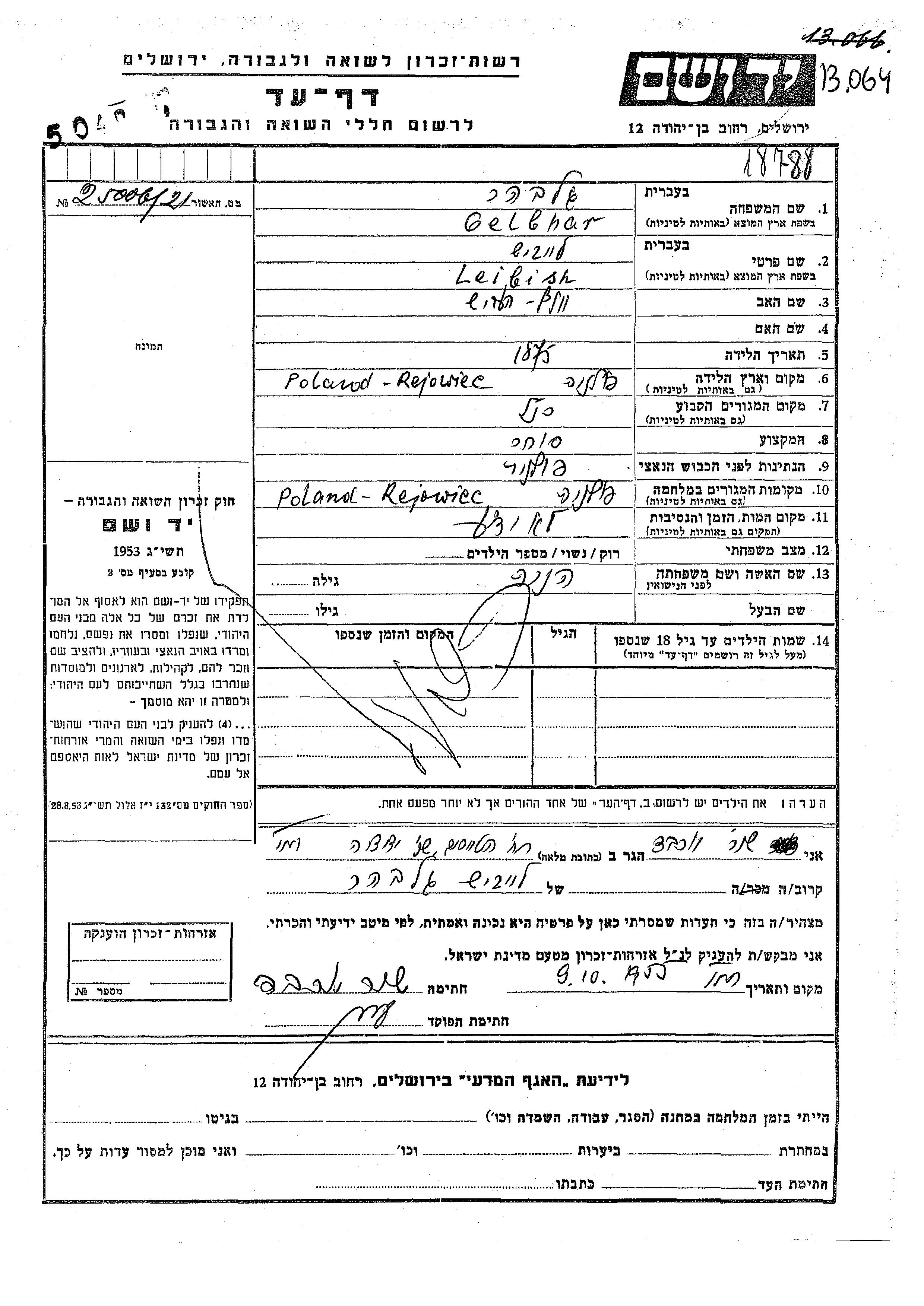 Гельбхар Лейбиш 1875 Реёвец, Польша Лист свидетельских показаний