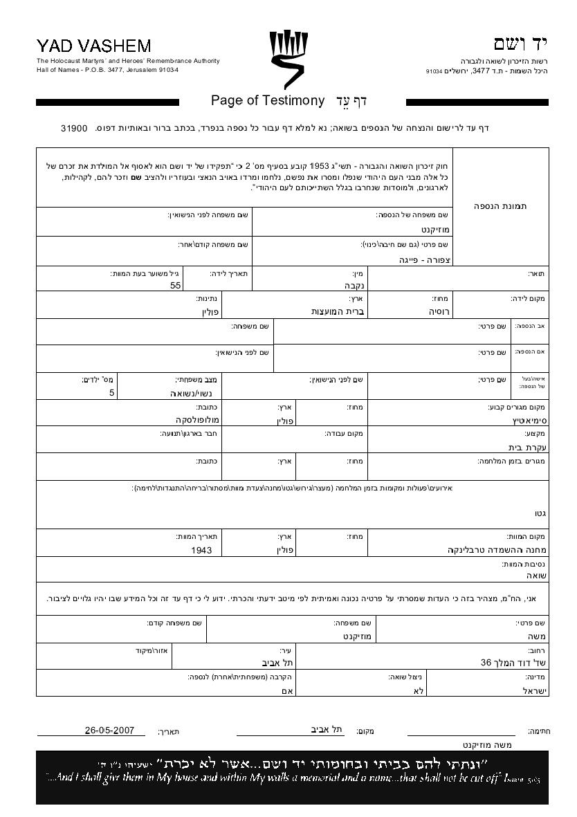 Ципора Фейга Музыкант, место рождения: Россия (СССР). Домохозяйка. Женат / замужем. Место жительства до войны: Семятыче, Польша. Место во время войны: ГЕТТО.