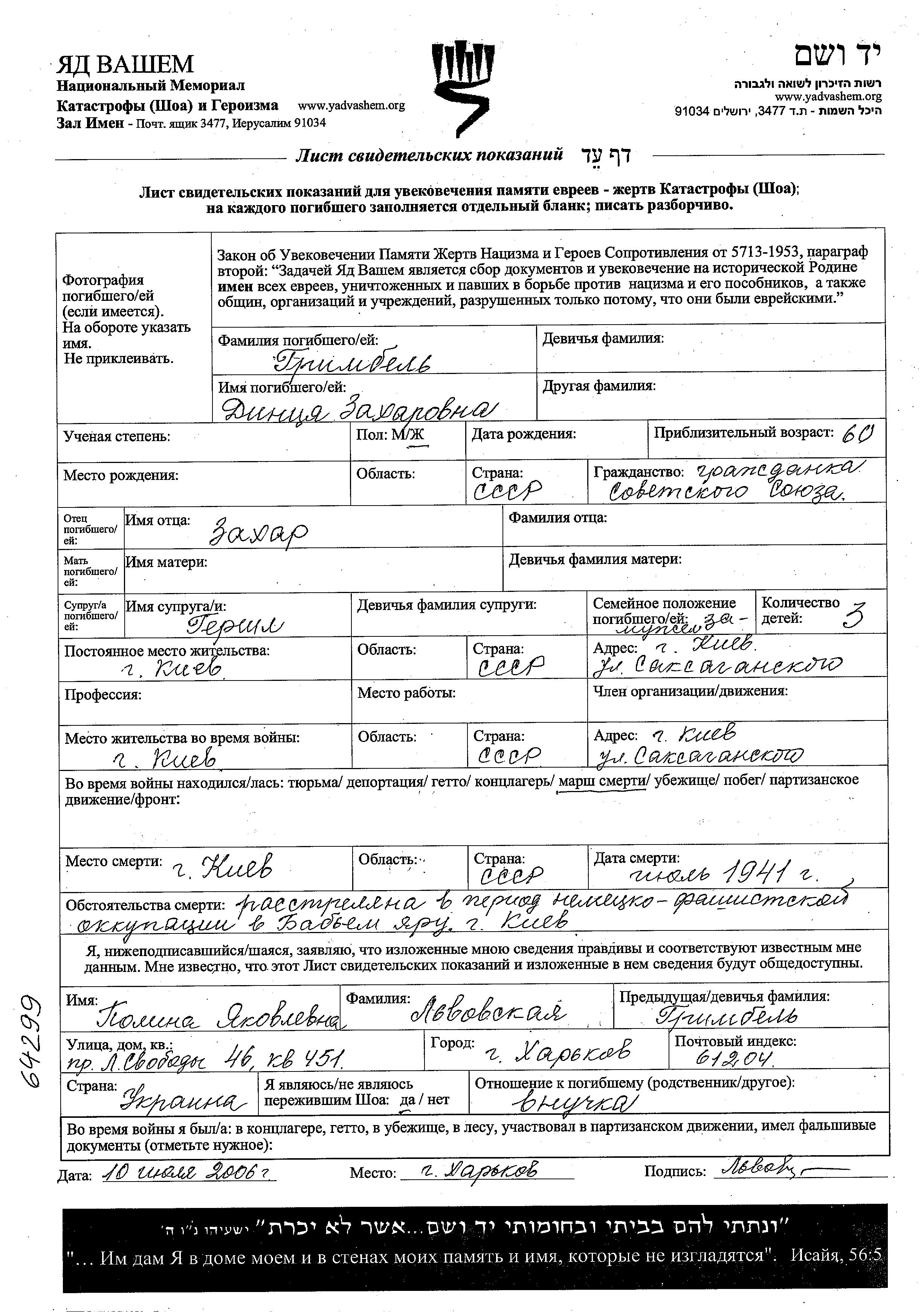 Гримбель Динця Киев, Украина (СССР) Лист свидетельских показаний