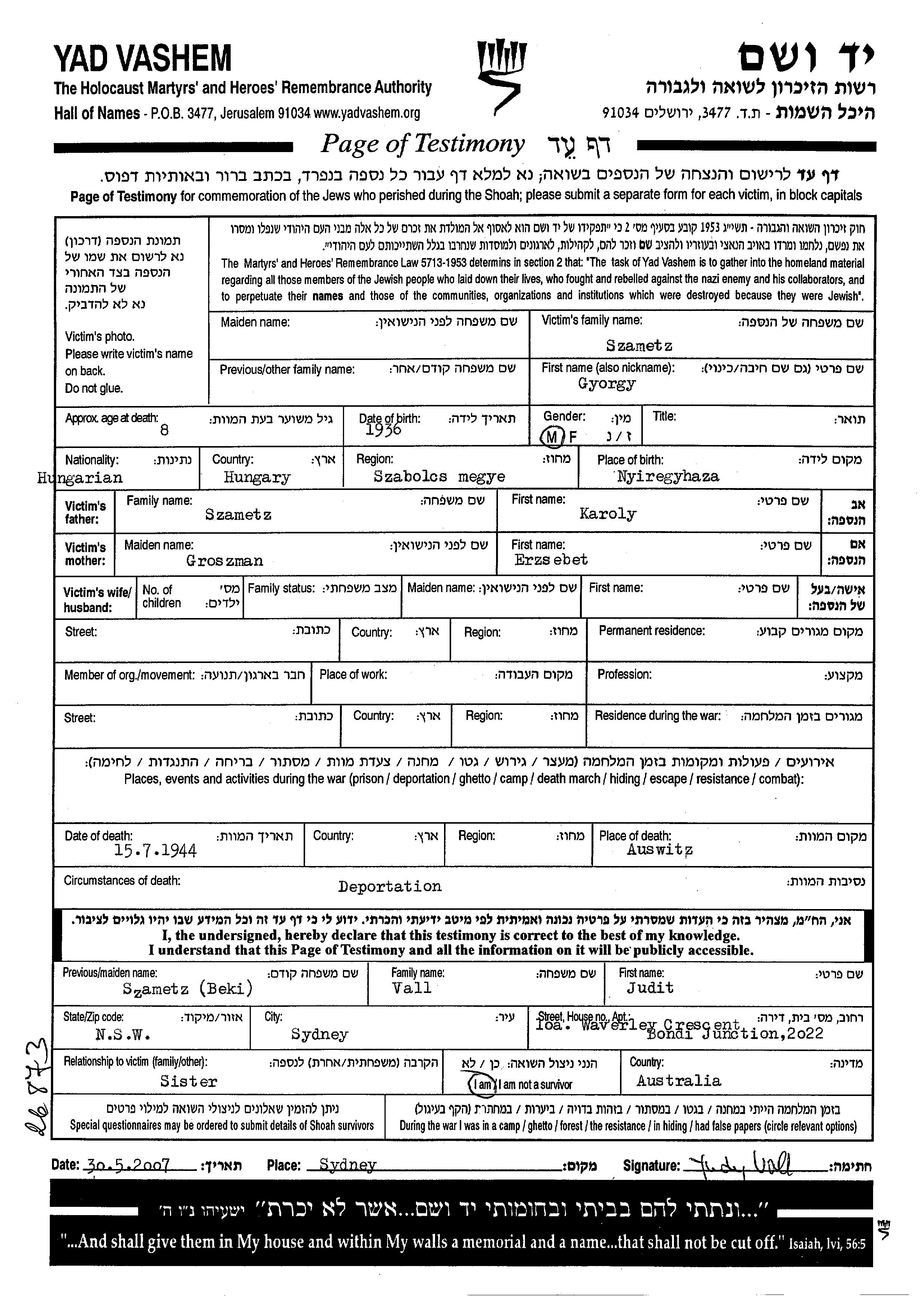 Дьёрдь Самец, место рождения: Ньиредьхаза, Венгрия. Отец: Карой, mать:Эржебет, девичья фамилия Гросман. Ребенок.