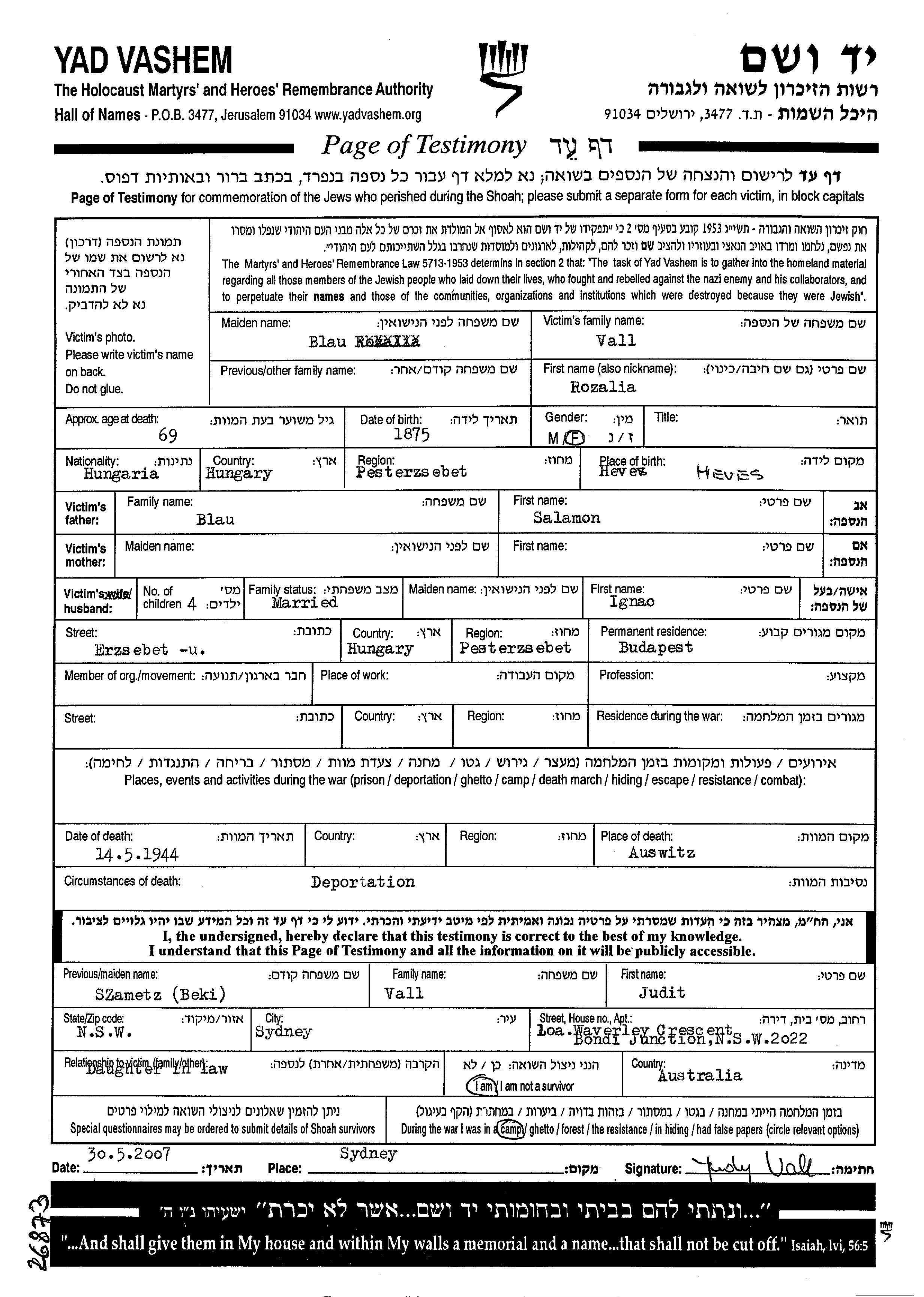 Розалия Вали, девичья фамилия Блау, место рождения: Хевеш, Венгрия. Отец: Саламон. Женат / замужем. Место жительства до войны: Будапешт, Венгрия.