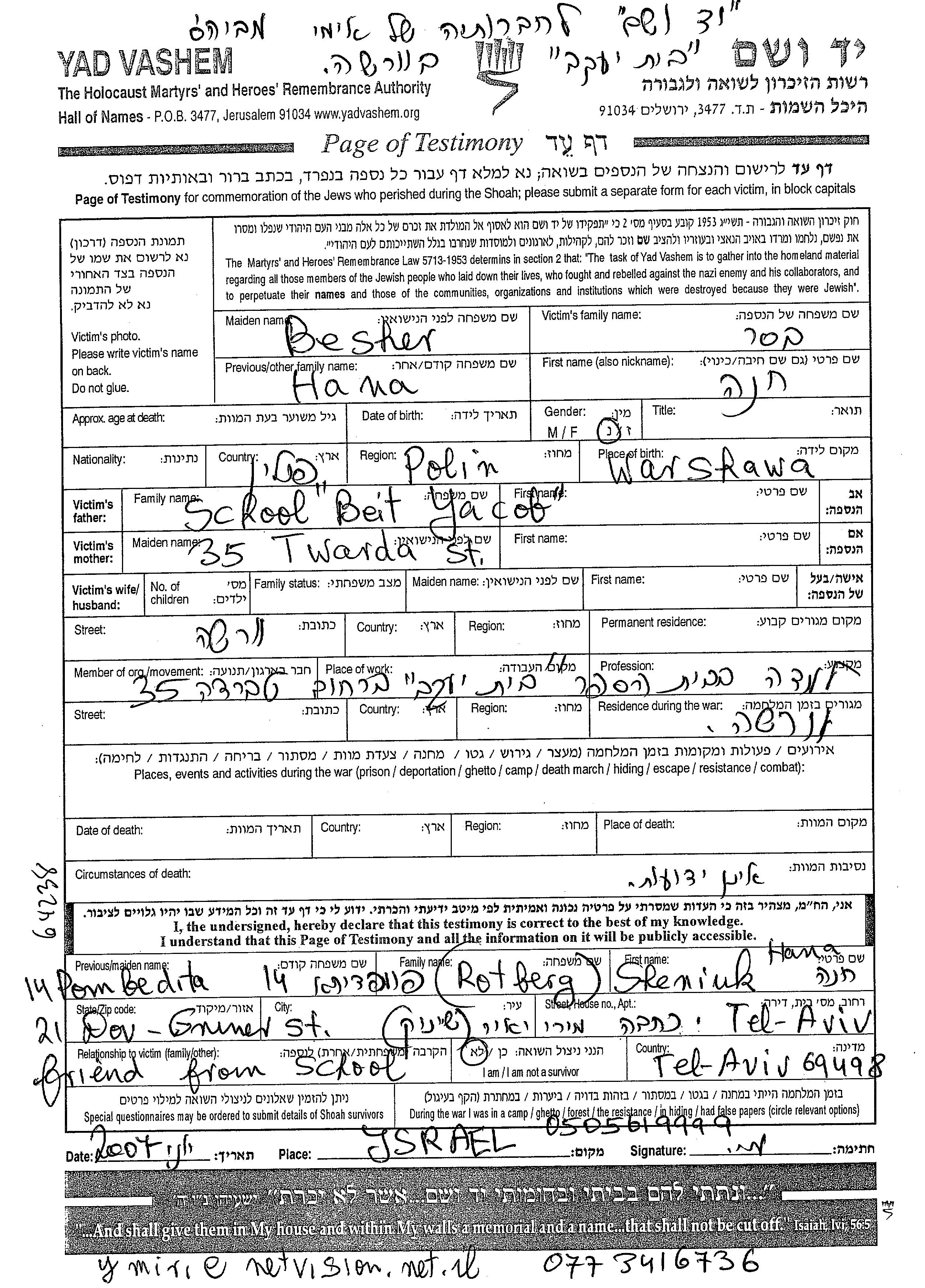 Бешер Басер Хана Варшава, Польша Лист свидетельских показаний