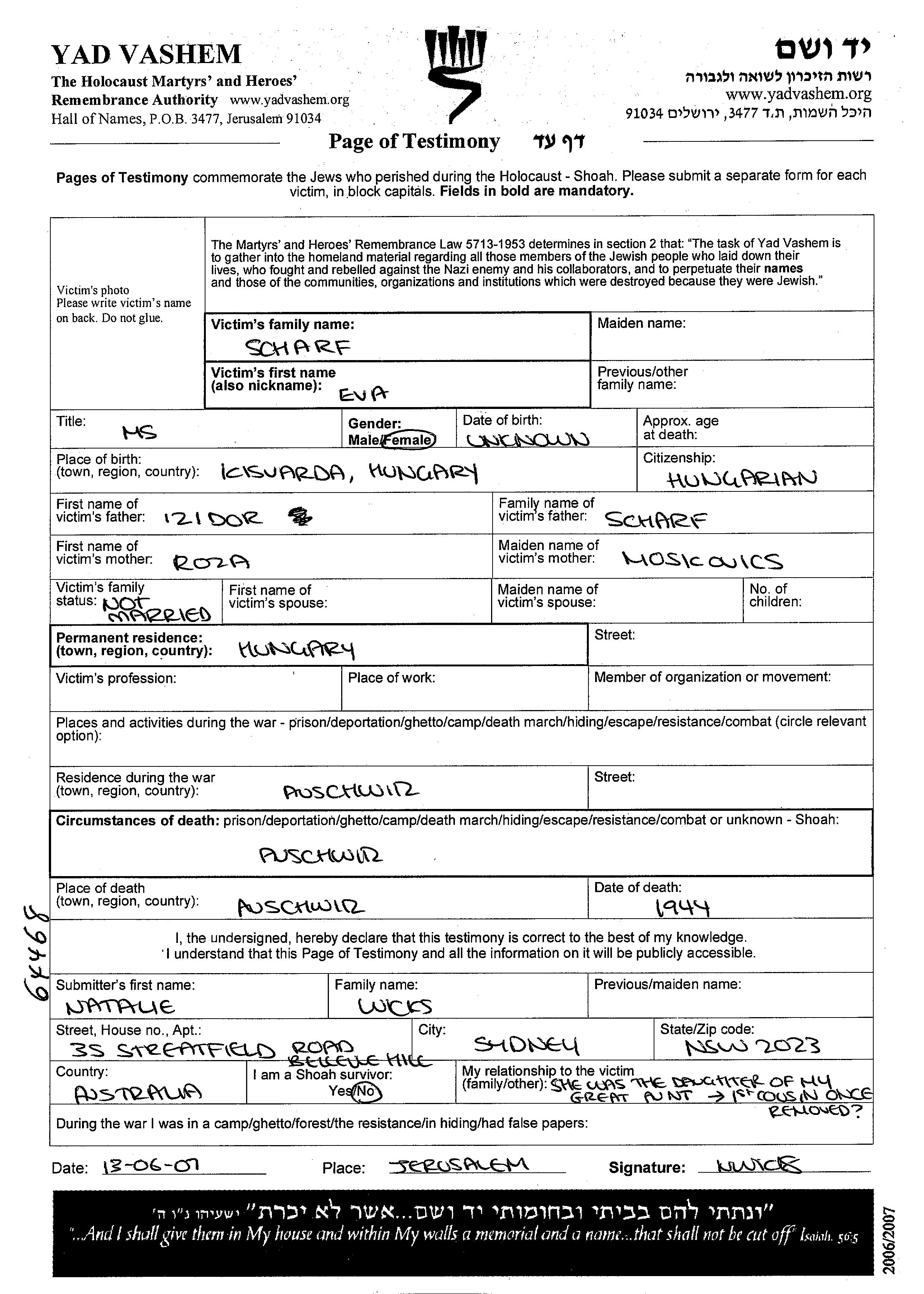 Эва Шарф, место рождения: Кишварда, Венгрия. Отец: Изидор, mать:Роза, девичья фамилия Москович. Холост / не замужем. Место жительства до войны: Венгрия.