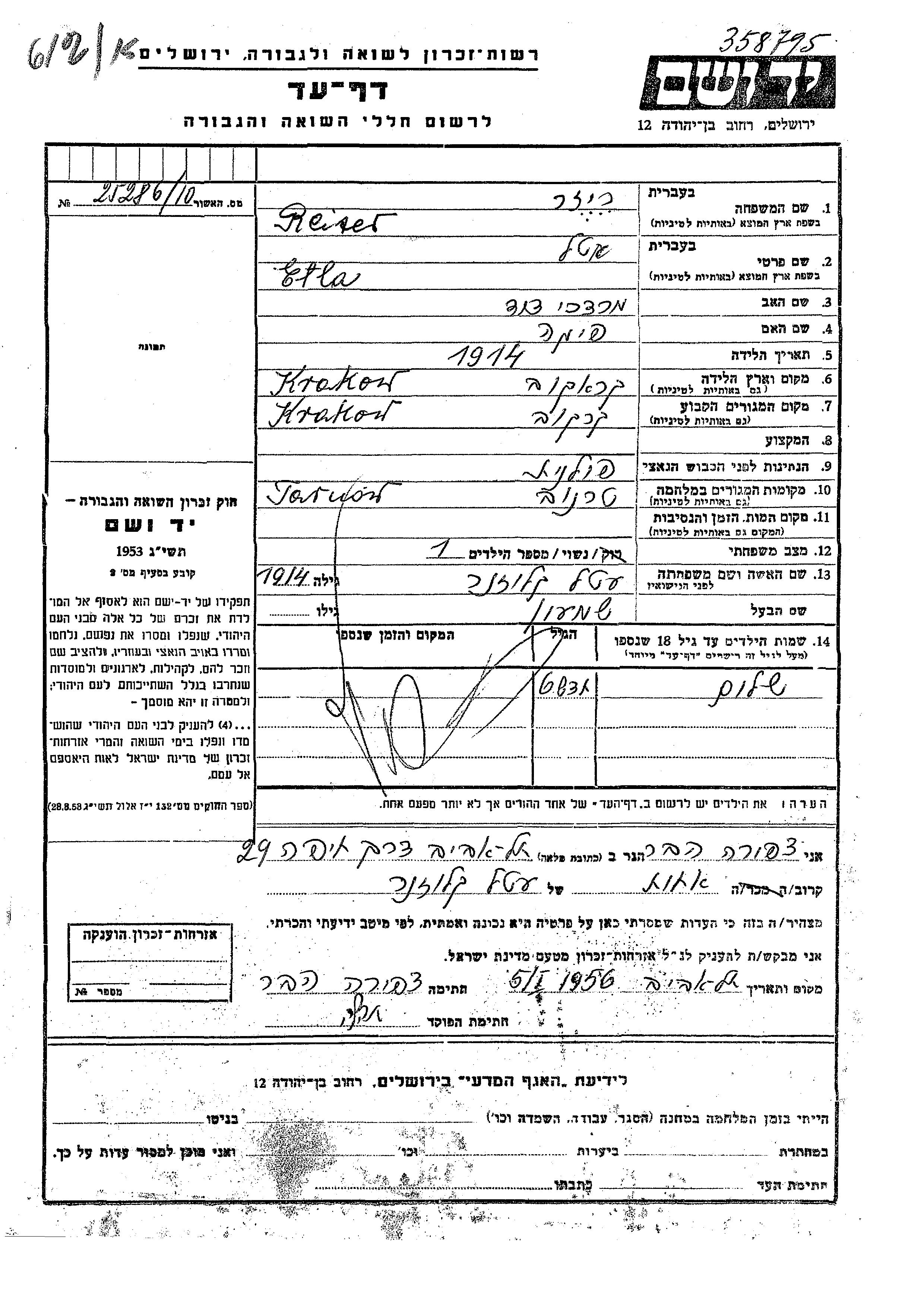 Рейсер Ризер Этла 1914 Краков, Польша Лист свидетельских показаний