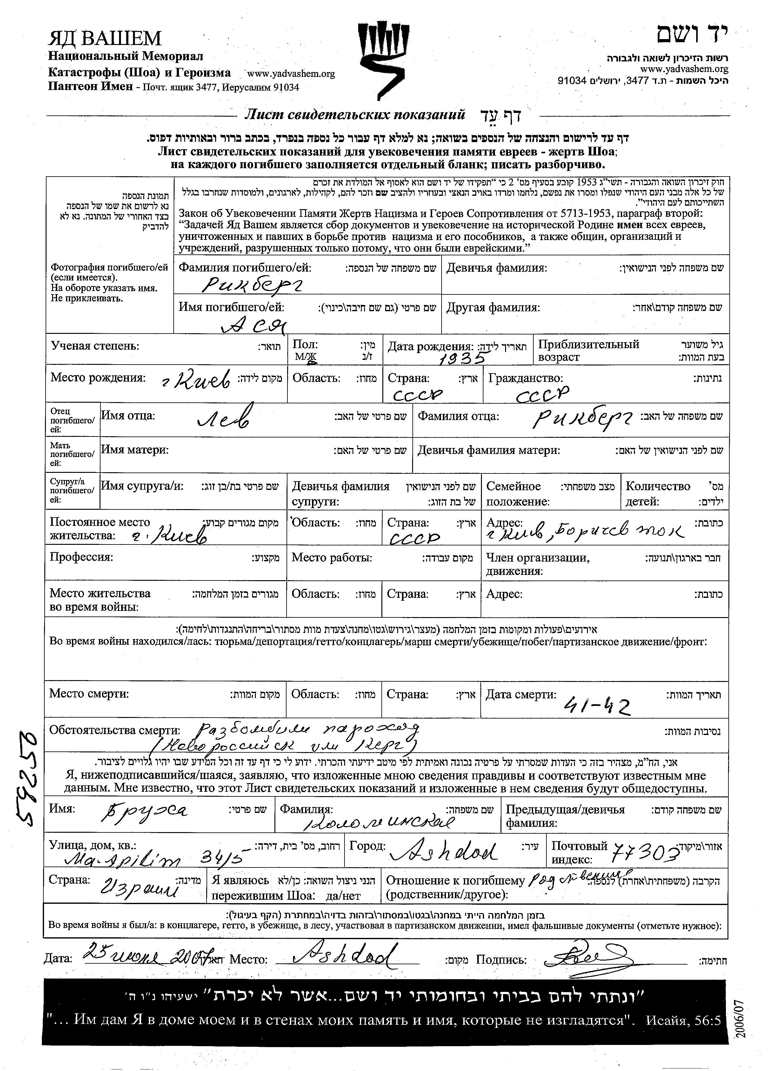 Рикберг Ася 1935 Киев, Украина (СССР) Лист свидетельских показаний