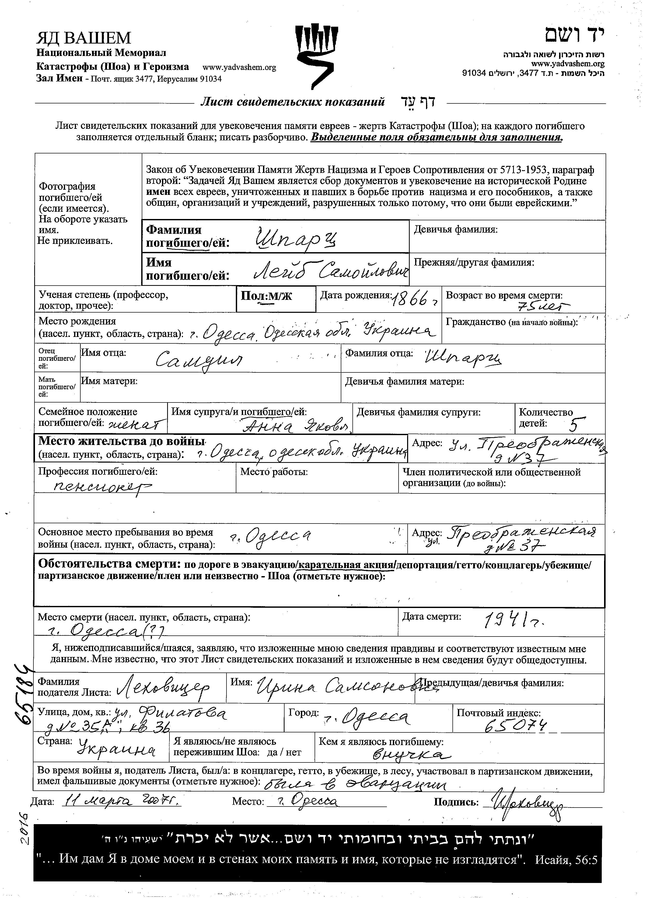 Шпарц Лейб 1866 Одесса, Украина (СССР) Лист свидетельских показаний