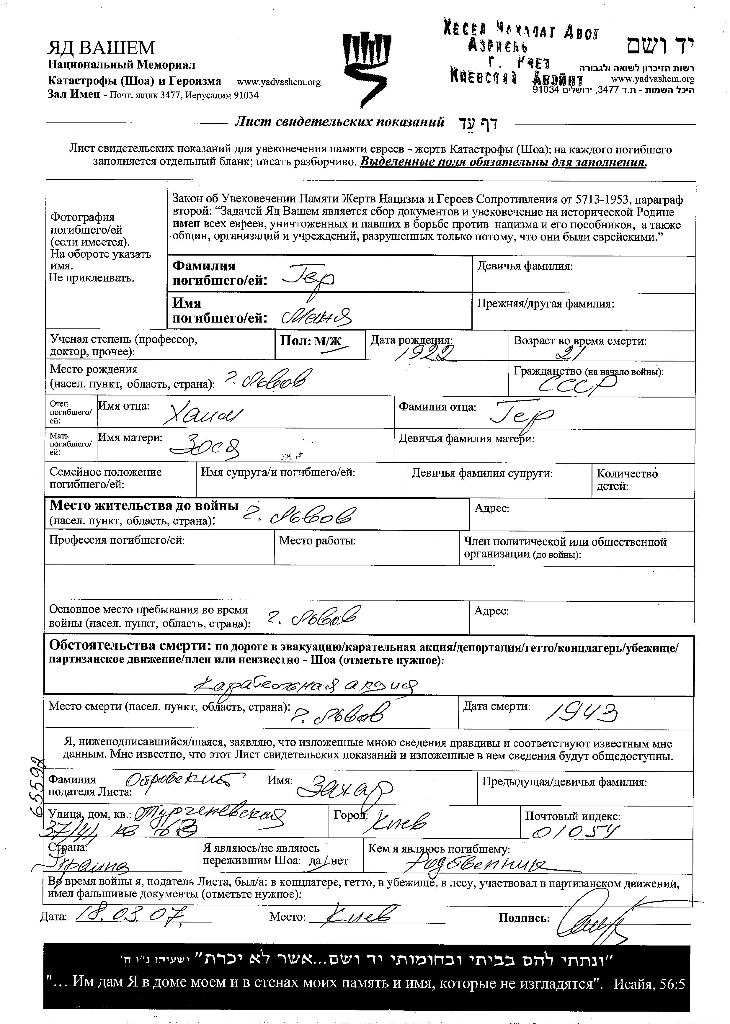 Яд Вашем - Листы свидетельских показаний Мемориального фонда