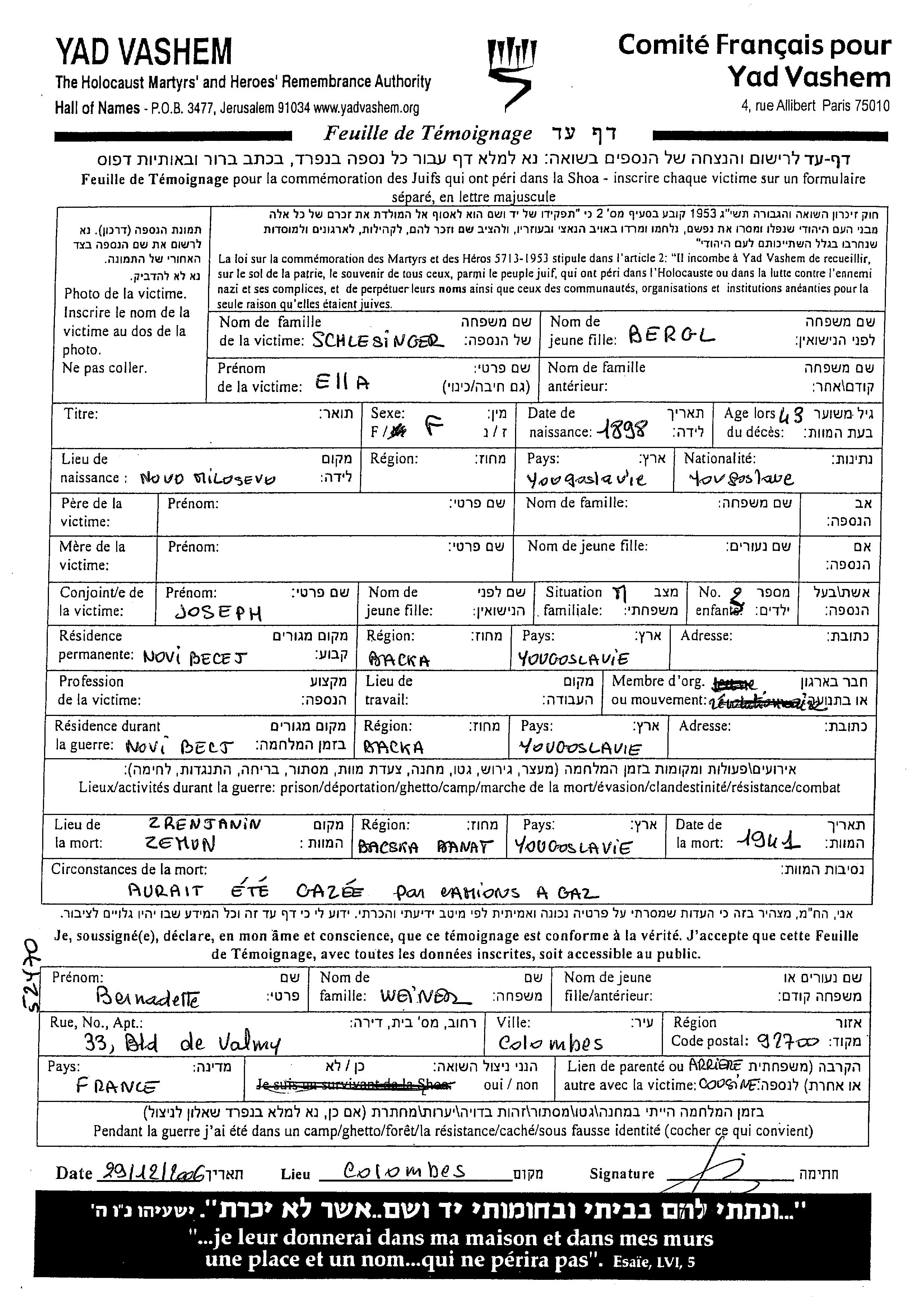Элла Шлезингер, девичья фамилия Бергль, место рождения: Ново Милошево, Югославия. Женат / замужем. Место жительства до войны: Нови Бечей, Югославия. Место во время войны: Нови Бечей, Югославия.