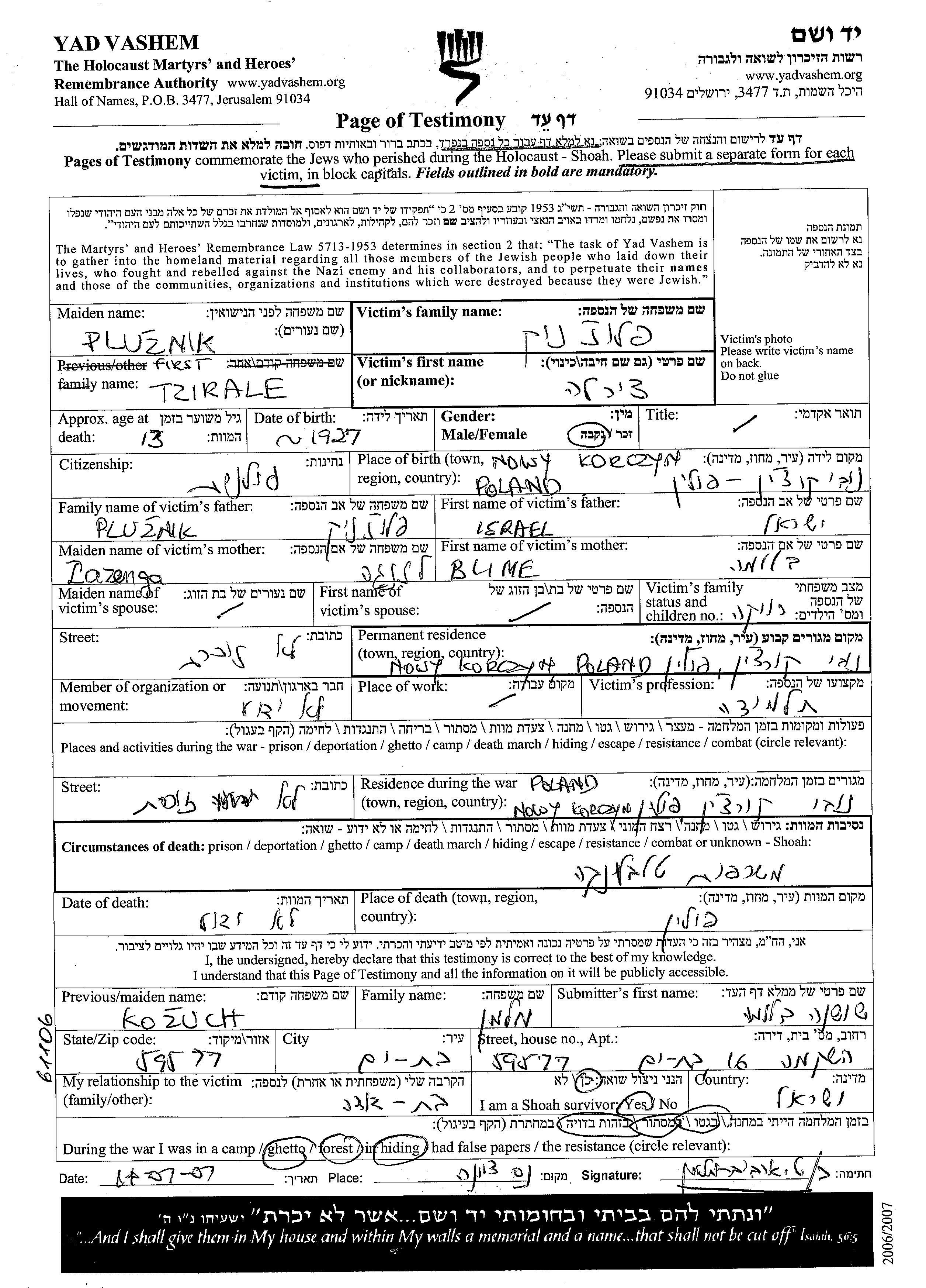 Цира Плузник, место рождения: Новый Корчин, Польша. Отец: Исраэль, mать:Блиме, девичья фамилия Лазенга. Ученик / ученица. Ребенок. Место жительства до войны: Новый Корчин, Польша. Место во время войны: Новый Корчин, Польша.