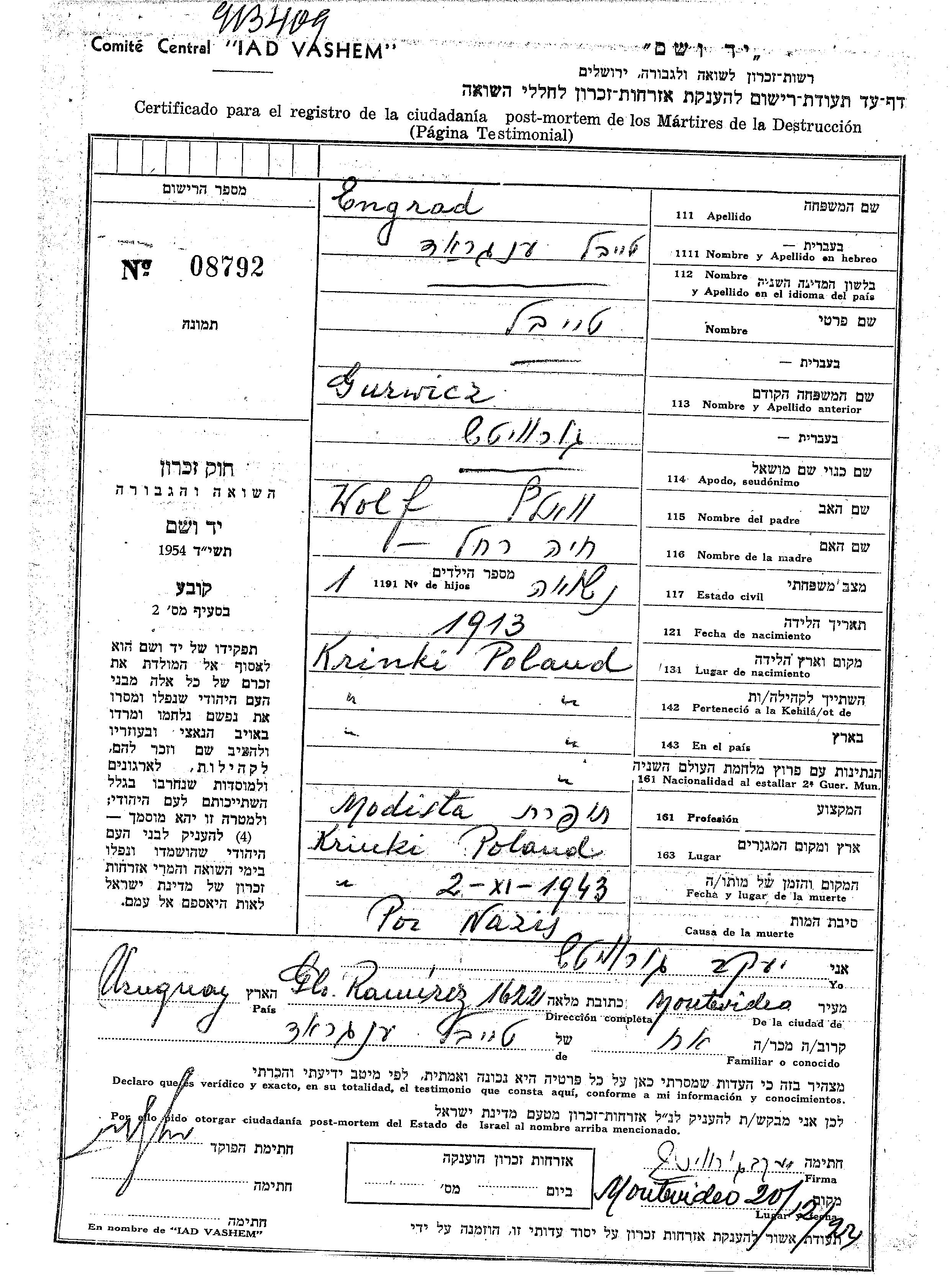 Тейбель Энград, девичья фамилия Гурвич, место рождения: Крынки, Польша. Отец: Вольф, mать:Хая Рахель. Швея. Женат / замужем. Место жительства до войны: Крынки, Польша. Место во время войны: Крынки, Польша.