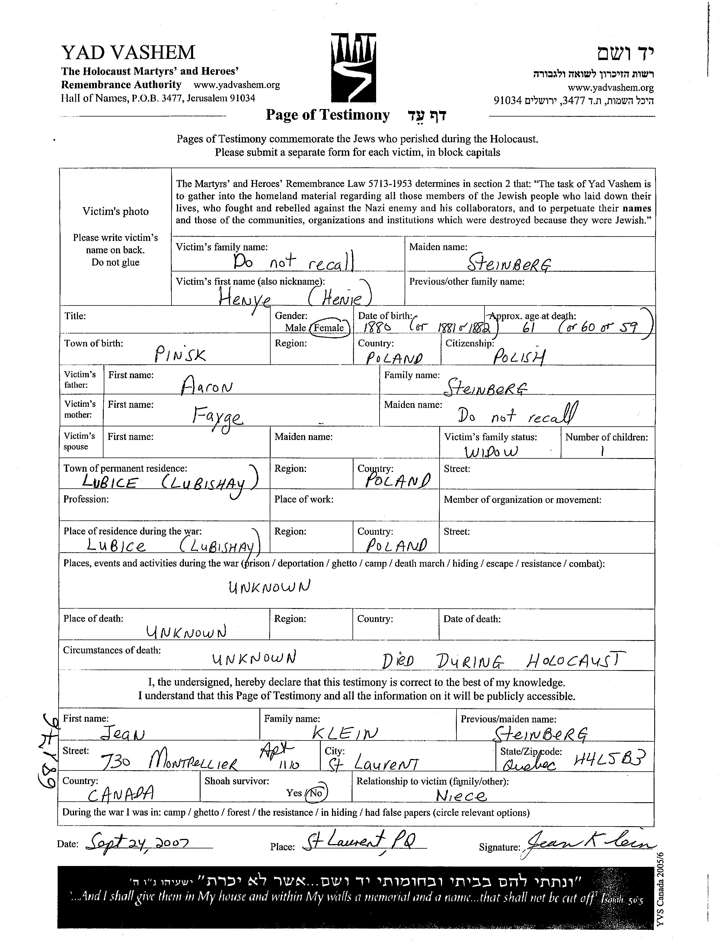 Хения Фамилия неизвестна, девичья фамилия Штайнберг, место рождения: Пинск, Польша. Отец: Аарон, mать:Файге. Вдова. Место жительства до войны: Любич, Польша. Место во время войны: Любич, Польша.