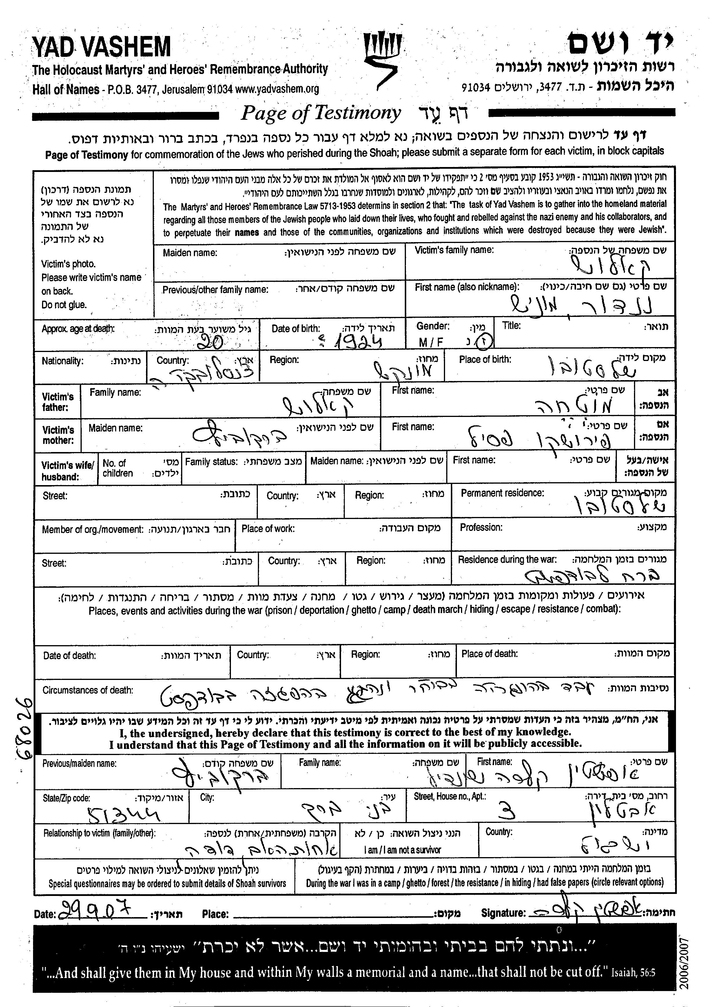 Нандор Муниш Калош, место рождения: Шелестово, Чехословакия. Отец: Мотхе, mать:Пирошко Песил, девичья фамилия Берковиц. Место жительства до войны: Шелестово, Чехословакия. Место во время войны: Будапешт, Венгрия.