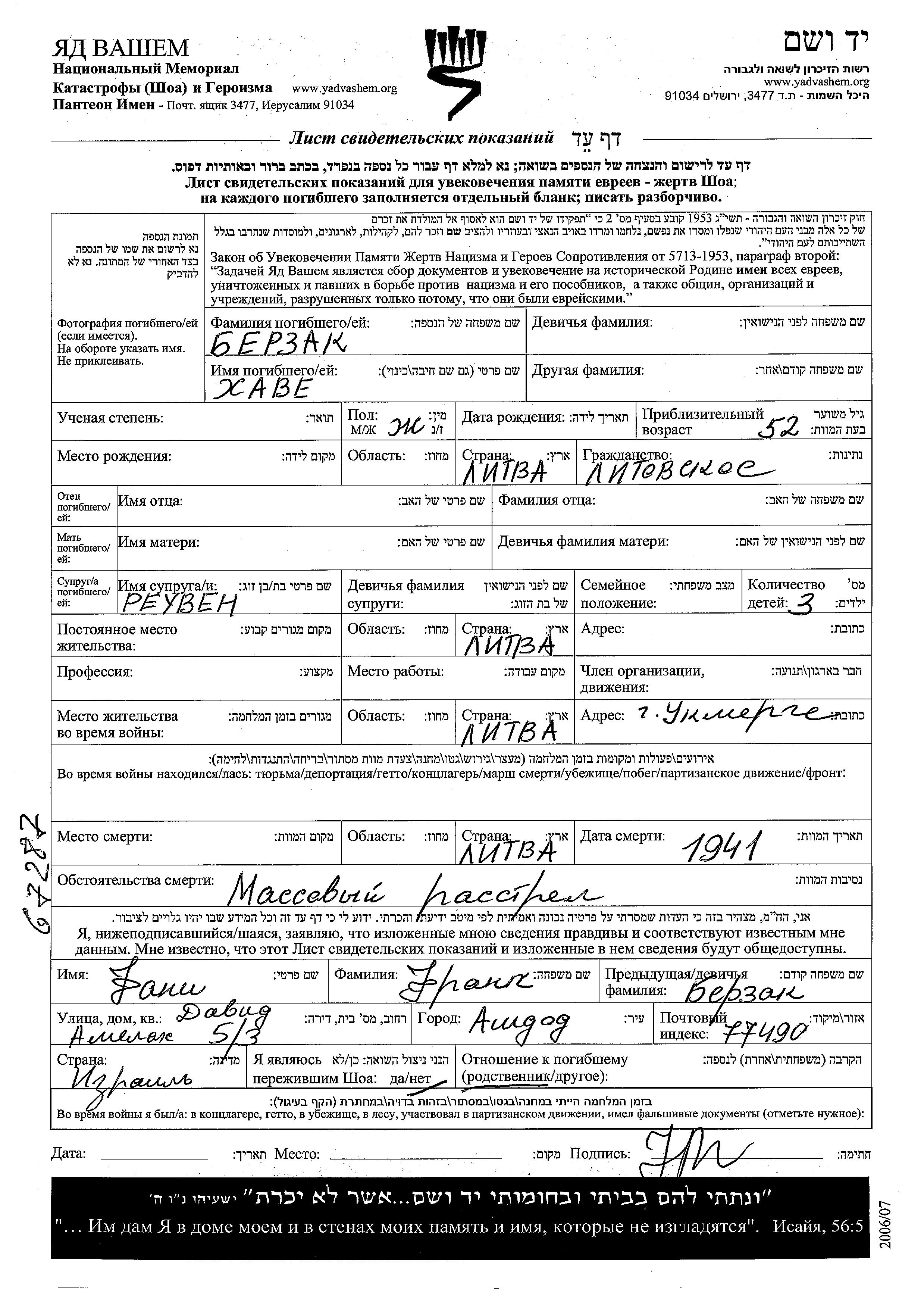 Яд Вашем - Листы свидетельских показаний Мемориального фонда