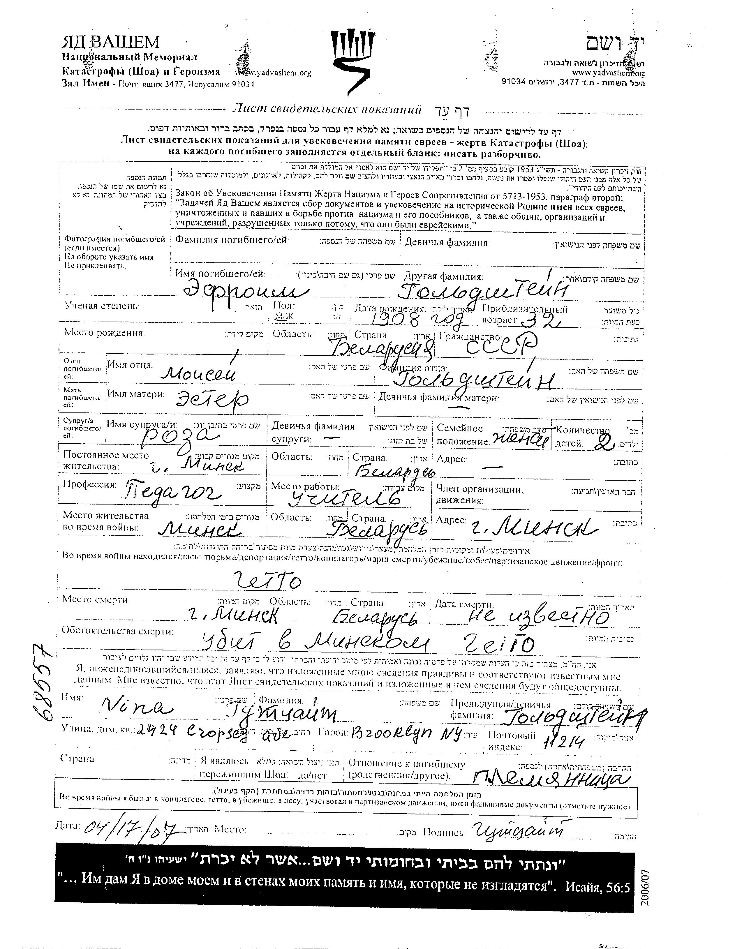 Яд Вашем - Листы свидетельских показаний Мемориального фонда